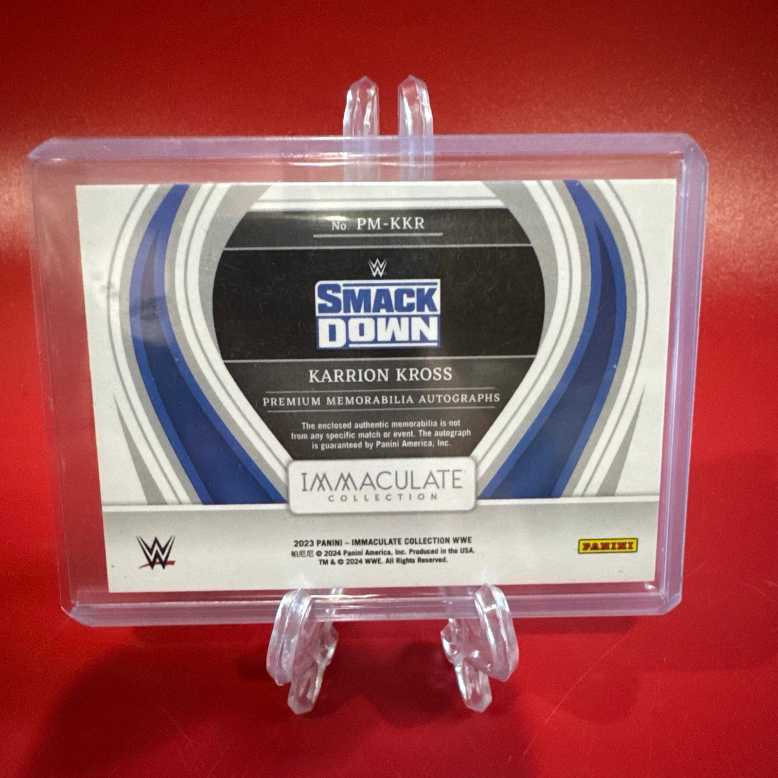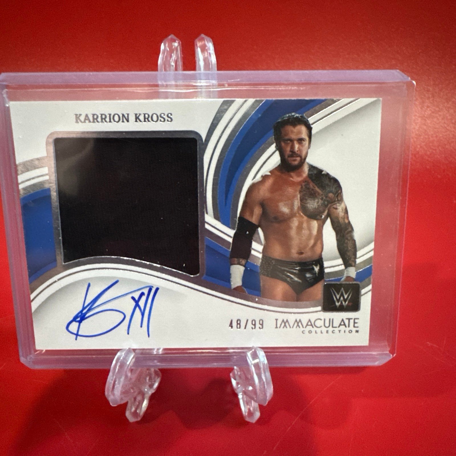 The product is a 2023 WWE Immaculate Collection patch-autographed trading card featuring Karrion Kross. This card is numbered 48 out of 99 and is signed by Karrion Kross in a hard-signed format. Produced by Panini, the card is authenticated by Panini Authentic and is part of the Immaculate Collection insert set. With a piece of memorabilia included, this highly collectible card is a must-have for fans of wrestling and Karrion Kross.