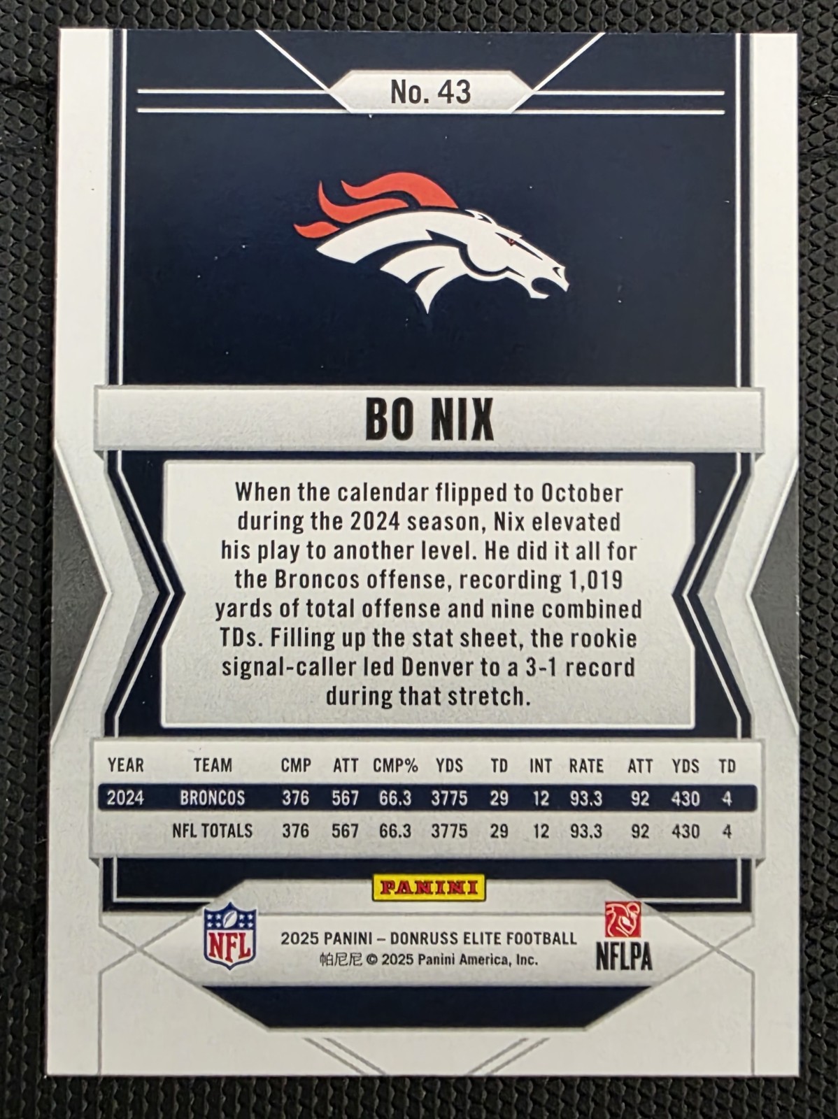 The 2025 Donruss Elite Status Green Explosion Bo Nix trading card is a highly collectible sports card featuring the football player Bo Nix from the Denver Broncos. This original card is part of the 2025 Donruss Elite set and is numbered out of 999. The green explosion parallel adds a unique touch to this limited edition card, making it a prized possession for any football card collector.