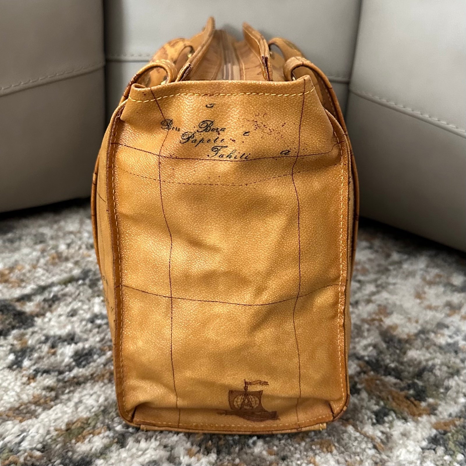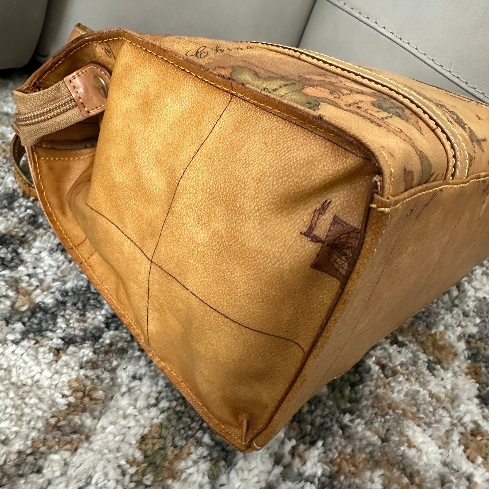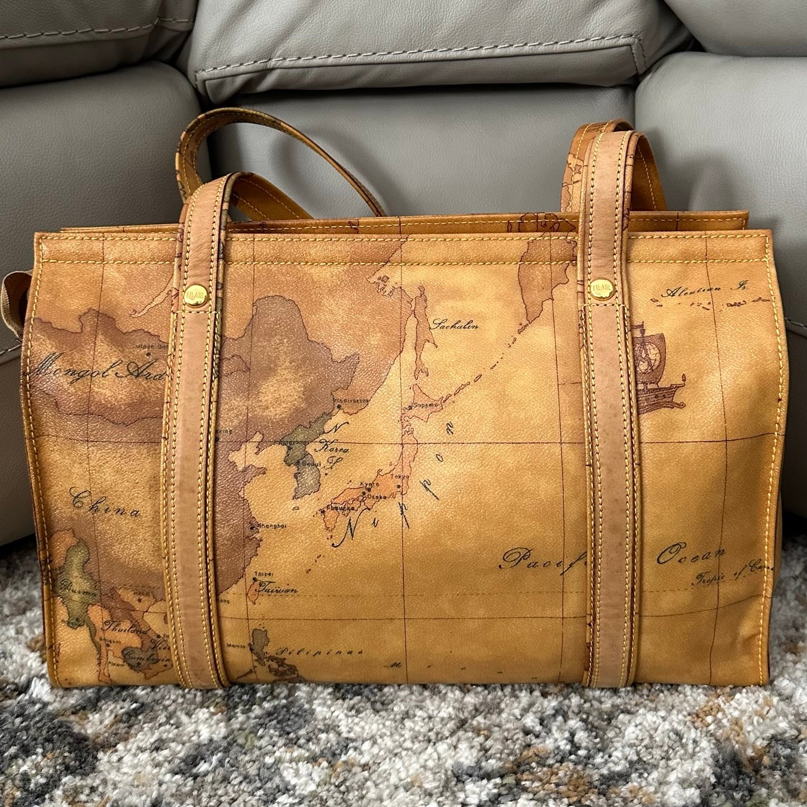 Beautiful! Unisex Coated Canvas Leather Trim Alviero Martini 1A Classe Medium Tote Geo Classic Map Bag. Outside Slip Pocket, Top Zip Closure With Inside Large Zip Pocket. Note: This Tote Does Show Damage/Staining On The Inside Material Canvas (see pics) And Has That Vintage Smell. Take To. Cobbler For A Cleaning. Sold As Is. Super Cool Sturdy Bag!
