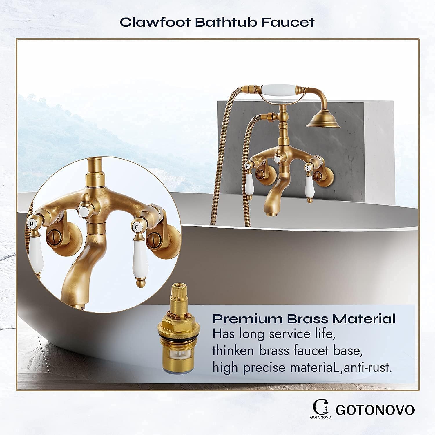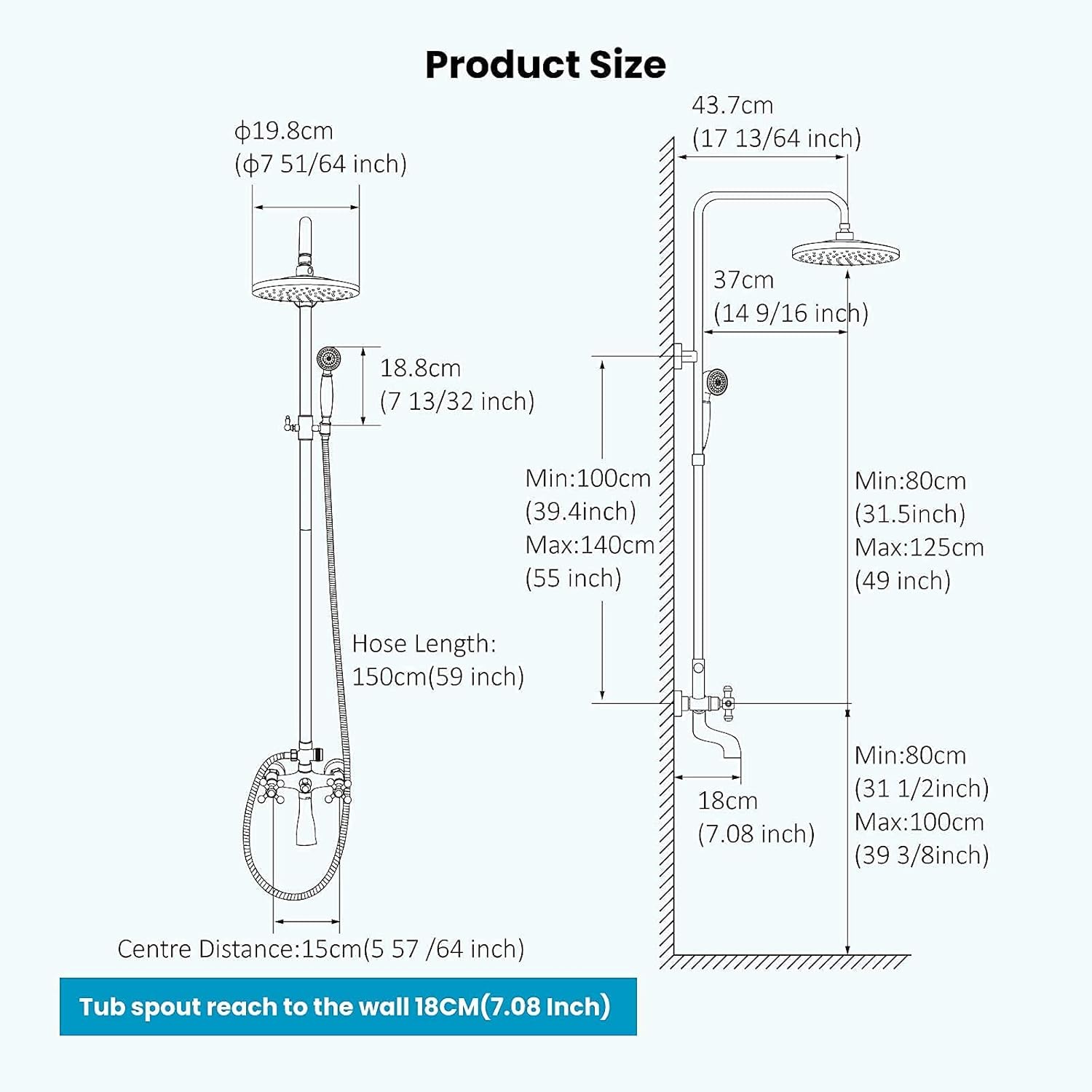 Product description Vintage bathroom shower faucet is for wall mounted installation and has antique brass finish to resist corrosion and tarnishing.The whole faucet has an 8 inch top shower and a hand held spray;suitable pore size is adjustable between 13cm-17cm.This wall mount bathtub faucet is made of premium brass material, antique brass finish to resist corrosion and anti-rust. 2 Function with handheld shower and tub filler.Shower Faucet Sets Details: Faucet Material: Brass Finish: Antique brass Mounting: Wall-Mount/2-Handle Top Showerhead: 20cm(8inch) Hole Center(hot and cold water) Distance On The Wall: 15cm(6inch) Slid Bar Height: Adjustable 80cm-120cm(31.4inch-47inch) Spray Hose: 150cm(59inch) Connection: NPT1/2 Clawfoot Bathtub Faucet Details: Material:Brass Color:Antique Brass Installation:Wall Mount, 2 holes Spray hose:150cm(59") Weight: 2.45kg(5.39 pounds) Spout reach:11 cm(4.3’’)