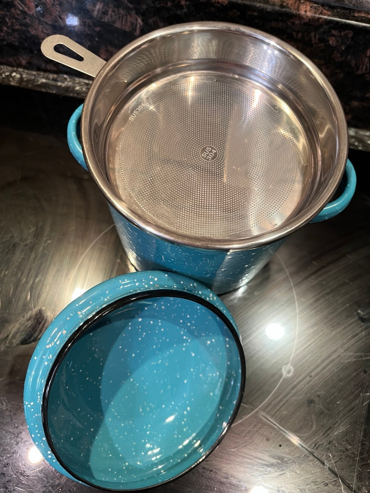 The Pioneer Woman Grease Catcher Strainer Insert & Lid is a medium-sized mesh strainer made of enamel on steel, featuring a teal speckle design. With a farmhouse style, this strainer includes a lid and handles for easy use. Ideal for catching oil, this set is perfect for keeping your kitchen clean and organized while adding a touch of rustic charm with the Pioneer Woman brand.
