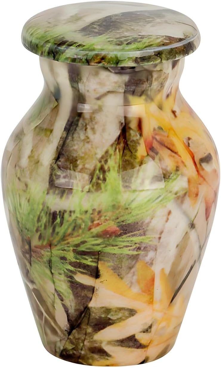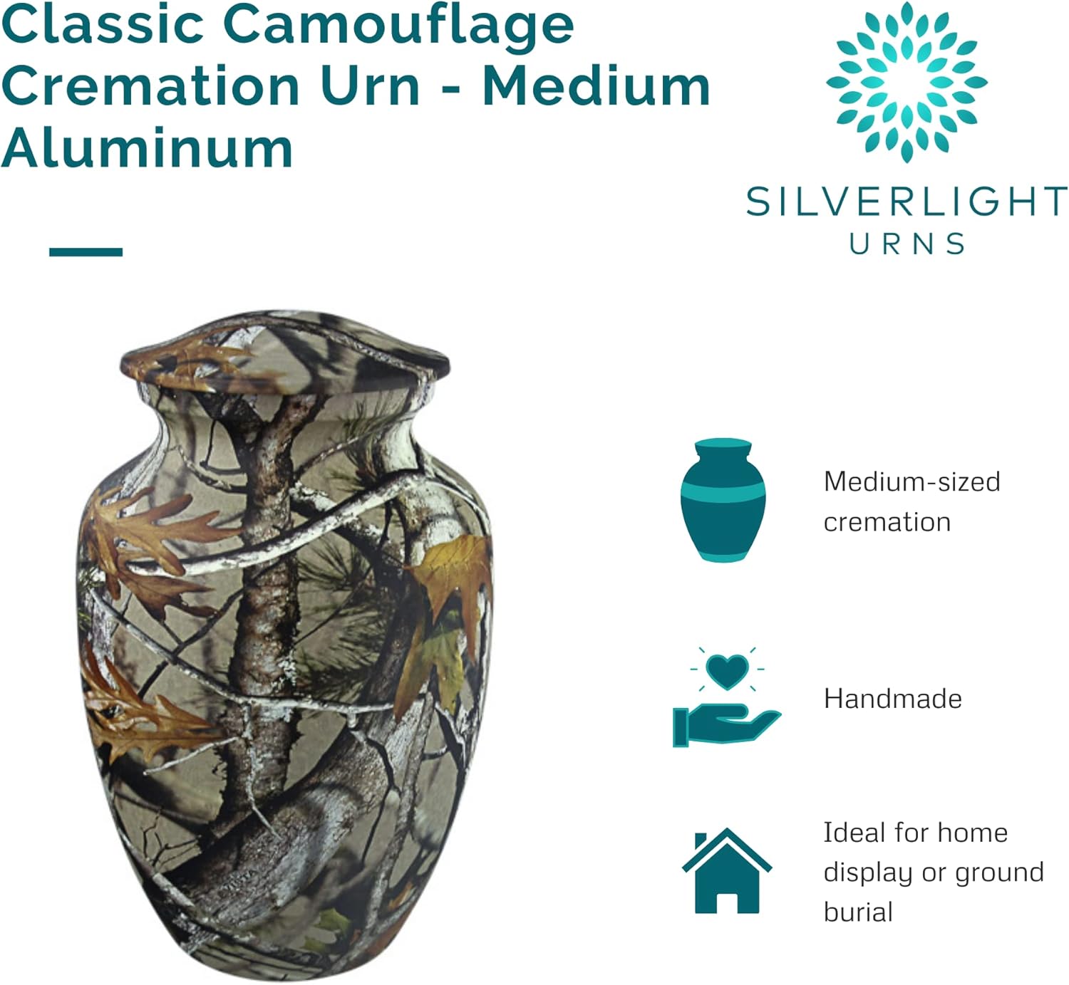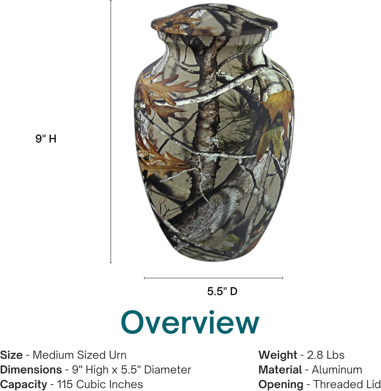 Perfect for the avid hunter or lover of the outdoors, the Classic Camouflage Medium Urn for Ashes features the great Vista camo pattern in vibrant color, created through a special hand-dipped process by an American company.