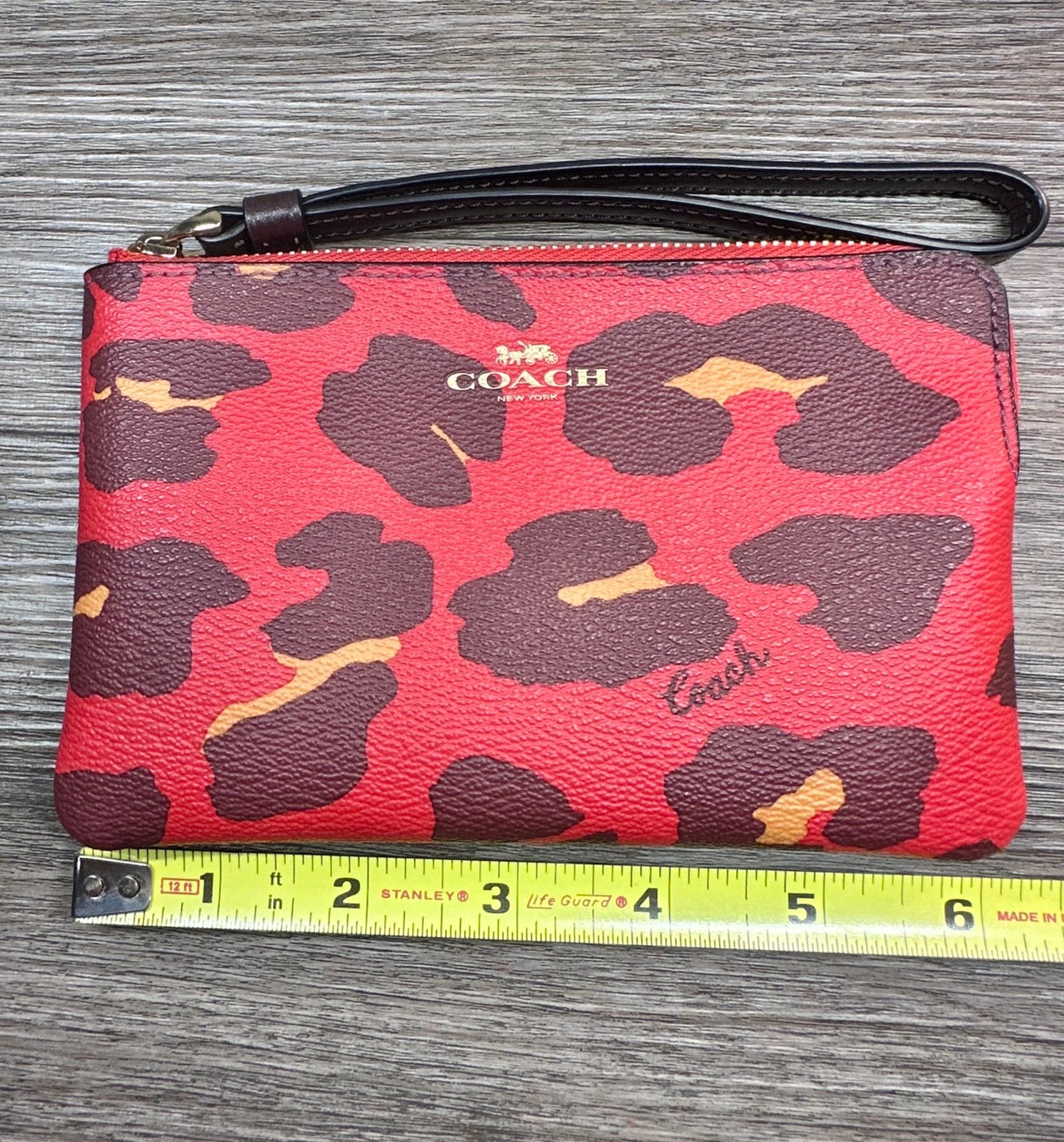 This is a Gorgeous Wristlet. Background is Red Leather with Brown flowers high-lighted w/a Light Orange in the flowers. To bring extra functionality please see the good looking corner zip!