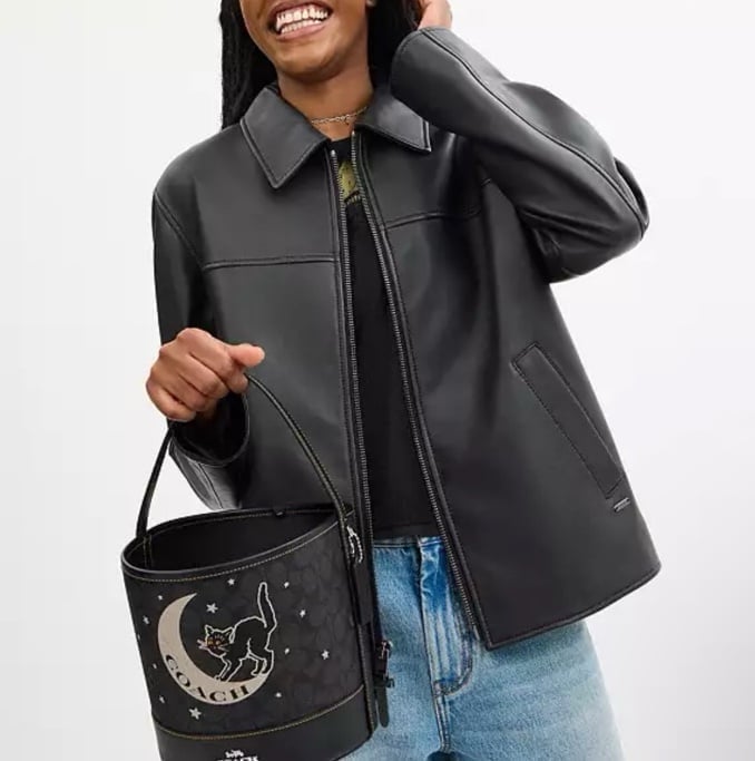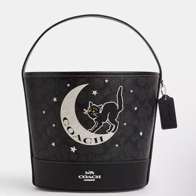 The Trick or Treat Bucket is crafted of Signature Coated Canvas and Smooth Leather. This designer Halloween trick or treat bag is perfect for stashing away candies in its spacious interior while you're on the go.