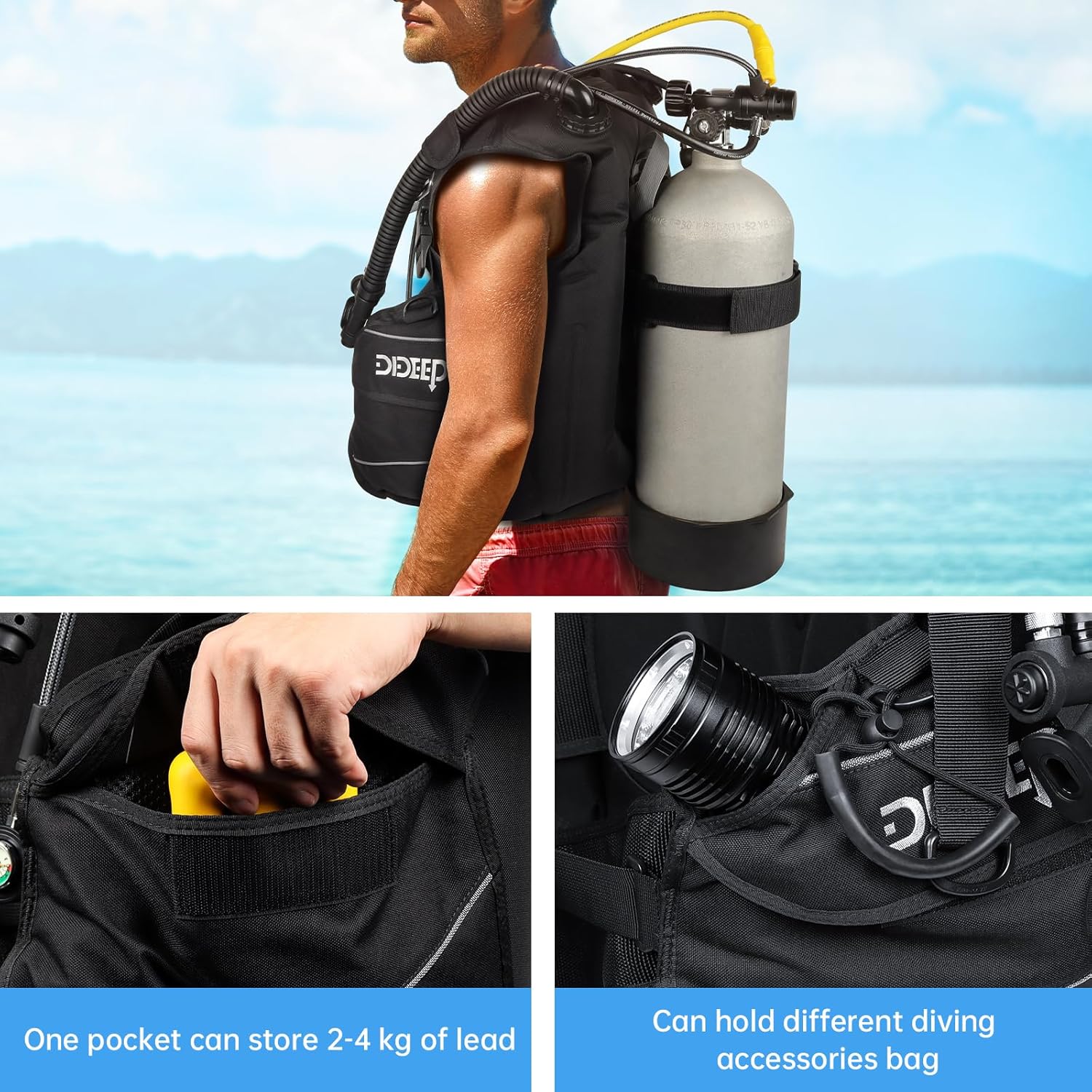 • DIDEEP scuba diving buoyancy compensator Device has a full-coverage area airbag to make neutral buoyancy easier