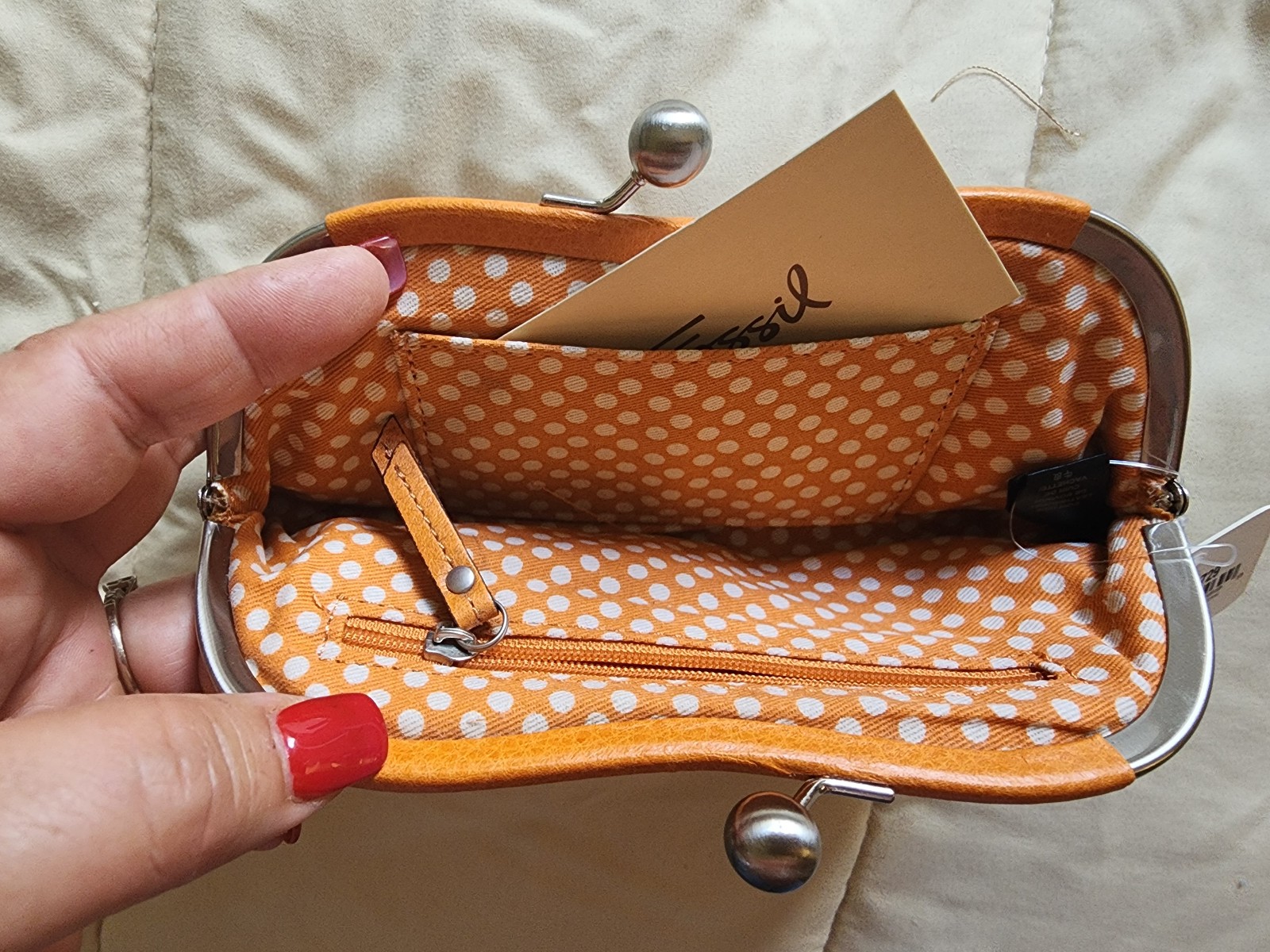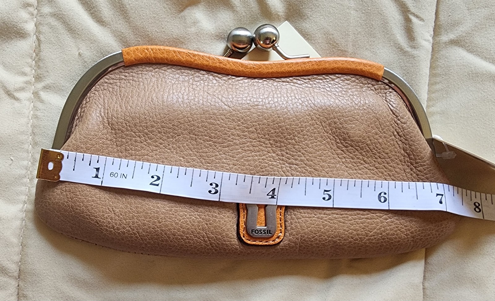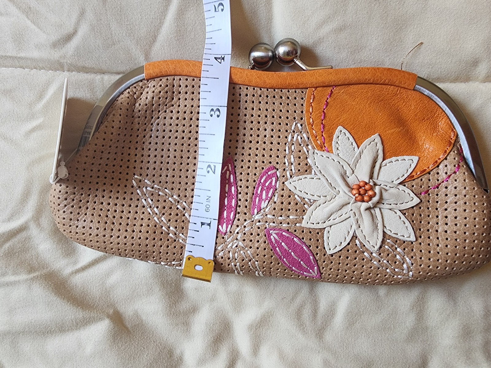 The Fossil Tan Orange Multicolor Leather Flower Print Clasp Wallet Purse is a stylish accessory for women with a floral pattern and stitch-like accents. Made of leather and featuring the brand's logo, this vintage-inspired wallet is a vibrant addition to any outfit. With a one-size design and a compact size of 7" in length and less than 1" in width, this purse is perfect for storing essential items while adding a touch of feminine flair. Made in China, this wallet is both practical and fashionable for everyday use.