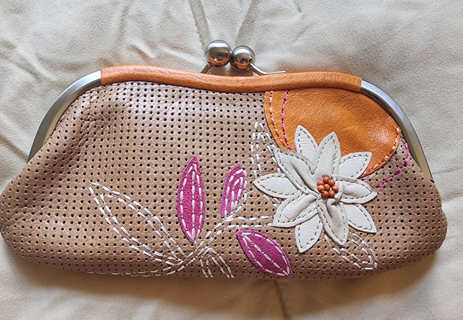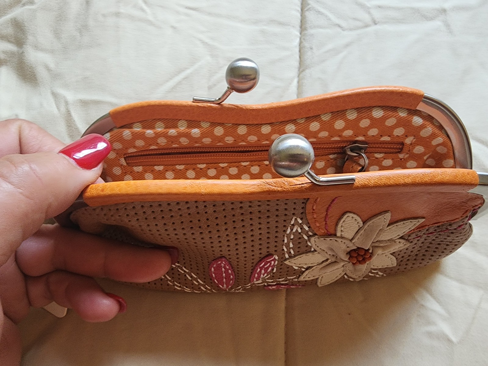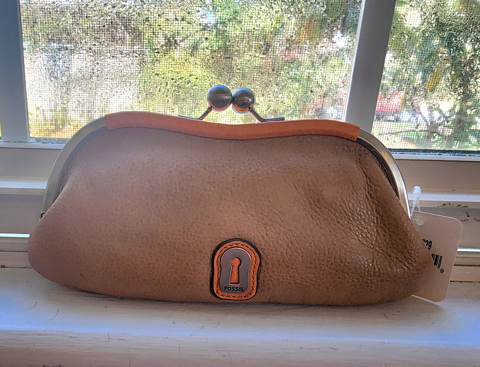 The Fossil Tan Orange Multicolor Leather Flower Print Clasp Wallet Purse is a stylish accessory for women with a floral pattern and stitch-like accents. Made of leather and featuring the brand's logo, this vintage-inspired wallet is a vibrant addition to any outfit. With a one-size design and a compact size of 7" in length and less than 1" in width, this purse is perfect for storing essential items while adding a touch of feminine flair. Made in China, this wallet is both practical and fashionable for everyday use.