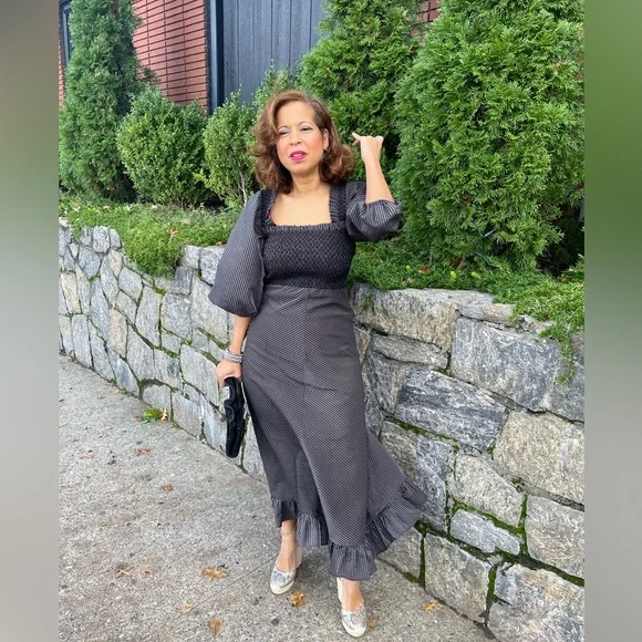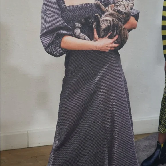 A Machine washZip fasteningModel is 178cm, a UK 8 and wears a size GR 34Square necklineCheck printBlouson sleeves hero silhouette you'll turn to season after season.Returning to its much-loved seersucker design with renewed modernity, Ganni presents a dress that perfectly typifies its understated yet appealing Scandinavian aesthetic. Crafted from a cotton-blend fabric which is beloved for its weightless feel and textural touch, the midi silhouette is finished with a cinched waist and delicate ruffles to the hem for an extra dose of femininity.44% Polyester42% Cotton14% PolyamideLength is 47”106