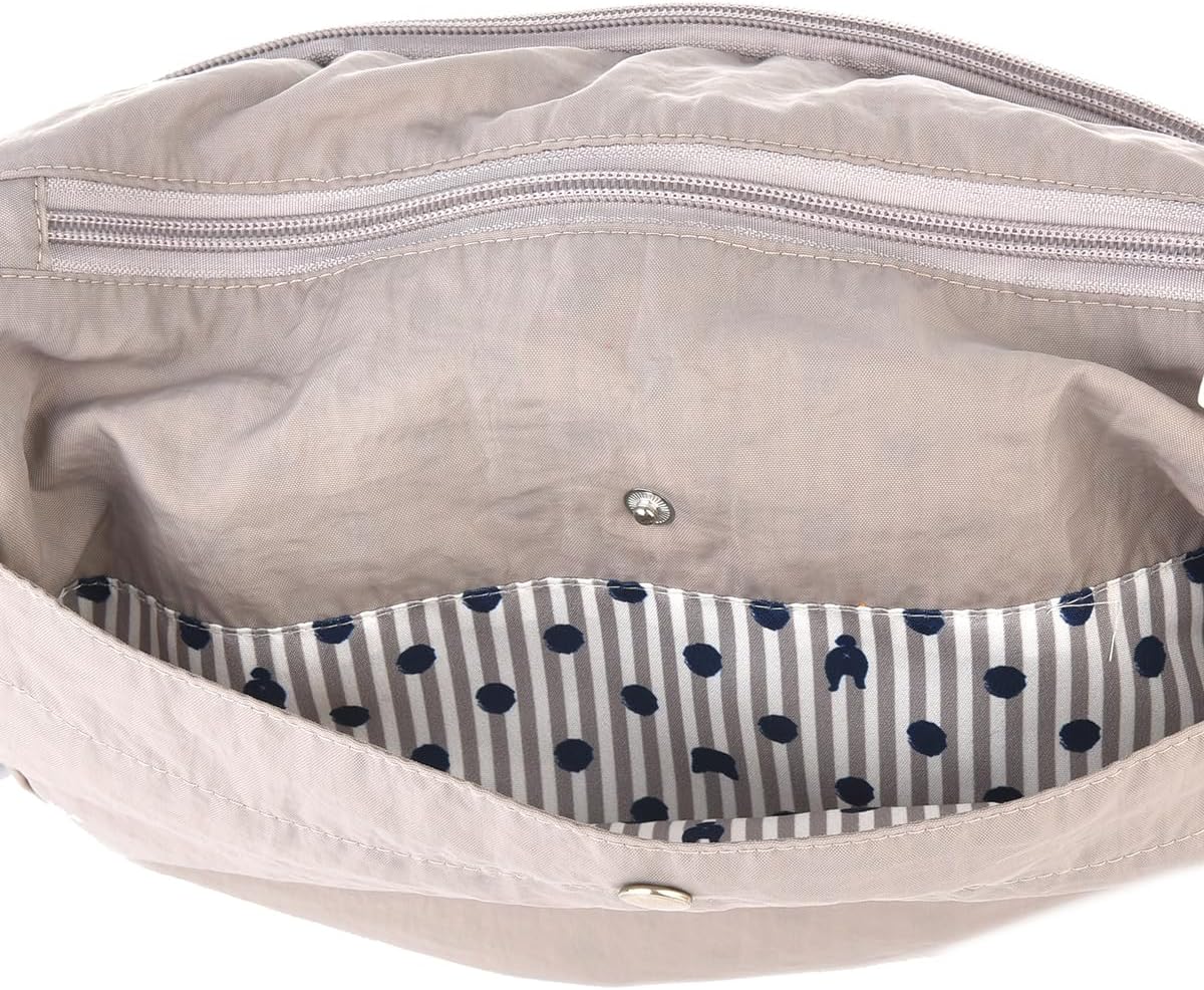Round shoulder bag with plenty of embroidery made of water-repellent nylon washer material to fit the body.