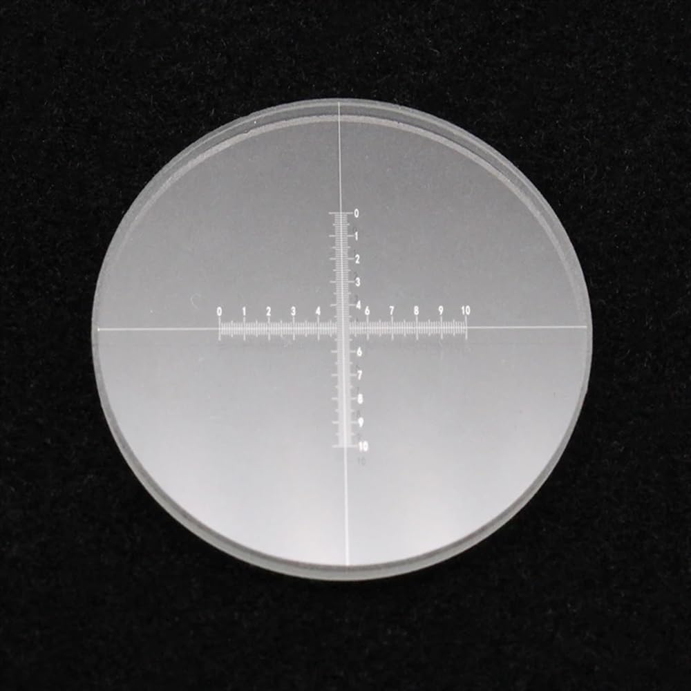 Specification Item Type: Microscope eyepiece micrometer Diameter: 20.4 mm, 21 mm, 22 mm, 23 mm, 24 mm, 26 mm, 27 mm, 28 mm or 29 mm Thickness: 1.5 mm Material: Optical glass Cross Ruler DIV = 0.1 mm X = 10 mm Y = 10 mm Package Included1x microscope eyepiece micrometer