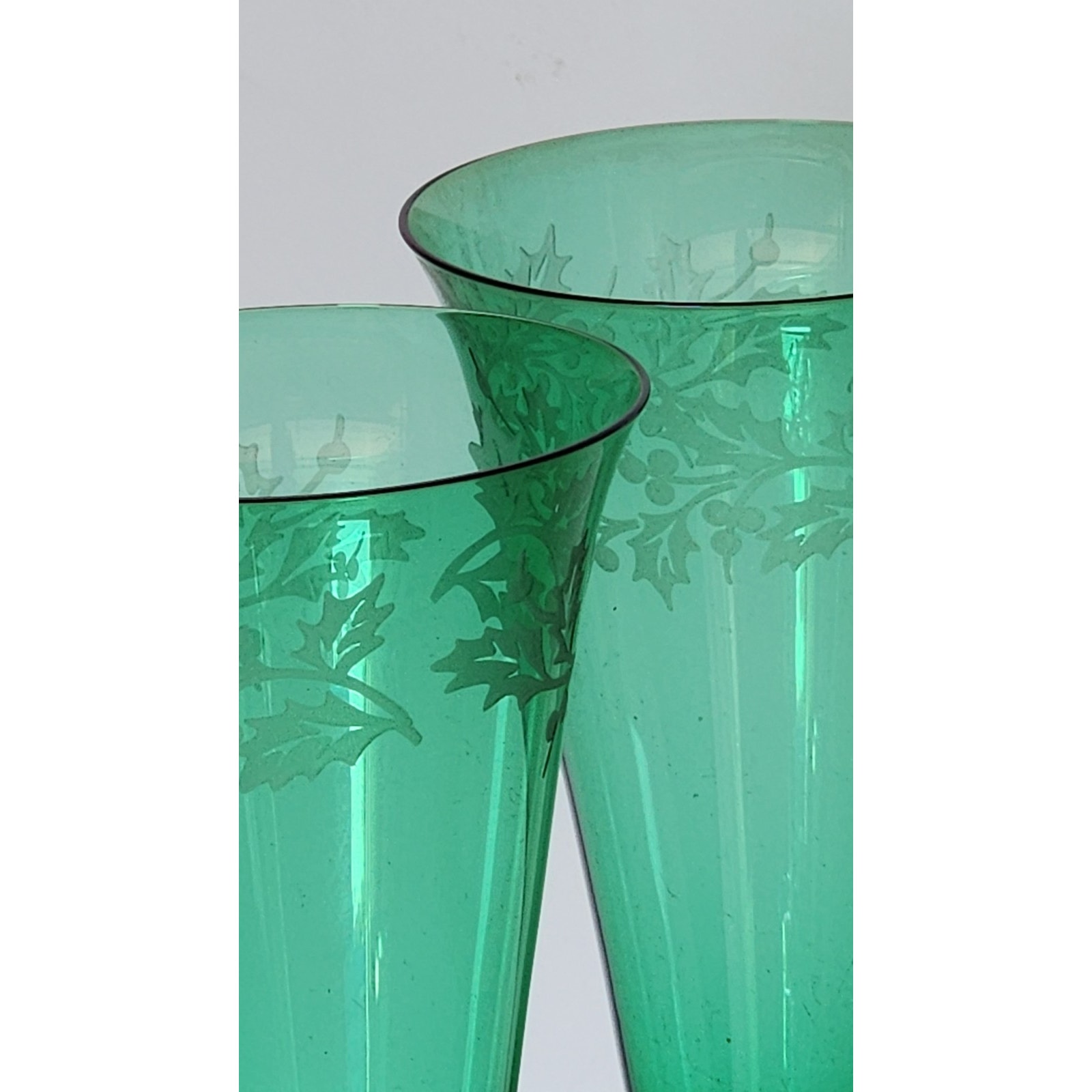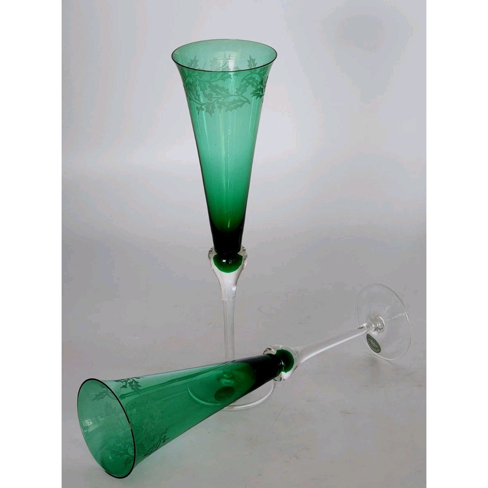Original stickers. The Lenox Holiday Gems Emerald Toasting Flutes Set of 2 Mistletoe pattern Champagne Glasses is a festive and elegant addition to any home bar or collection. Featuring a straight shape and a stenciled holiday design, these contemporary champagne flutes are perfect for all occasions. Made of green glass with a solid pattern and measuring 11 inches in height and 3 inches in width, these dishwasher-safe glasses are a timeless offering from the Lenox franchise. These champagne glasses bring a touch of holiday cheer to any celebration.
