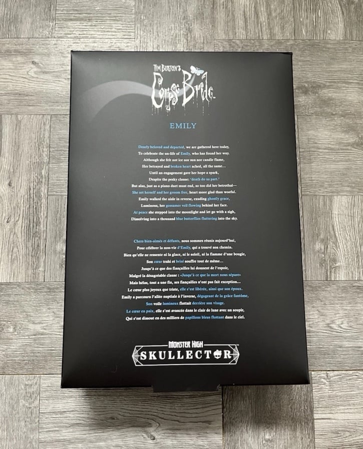 What’s that rhyme about what a bride needs -- something mold, something new, something buried, something blue? Well, like any true bride, Emily has her bases covered! This Monster High Skullector Corpse Bride doll is the picture of ghostly grace in her drop-dead gorgeous wedding dress and veil. She comes with Maggot, too, for some added moral support on her big day. With her butterfly accents and eerily elegant accessories, Skullector Emily doll makes a captivating creepsake for any collection! Doll stand included. Doll cannot stand alone. Colors and decorations may vary.