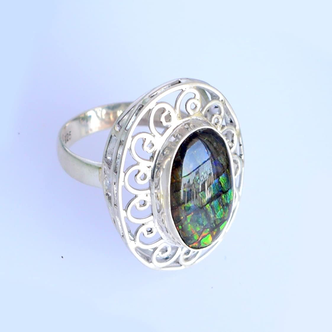 Celebrate the timeless beauty of nature with this exquisite Natural Ammolite Statement Ring, showcasing a stunning oval cabochon that radiates with multicolor brilliance. Expertly handcrafted in 925 sterling silver and plated with luminous white rhodium, this unique ring blends artisan elegance with the mesmerizing charm of fossilized gemstones. The 10x16 mm Ammolite centerpiece is carefully cut into a smooth oval cabochon, allowing its natural iridescent hues to shine through in rich tones of red, green, blue, and gold. Each ring is one-of-a-kind, with the Ammolite’s organic color play and fossil patterns making every piece a wearable work of art. Measuring 26x21x10 mm and weighing 10.2 grams, it has a bold yet graceful presence, perfect for both everyday wear and special occasions. Ammolite, derived from the fossilized shells of ancient sea creatures, is one of the rarest gemstones on Earth. Its shifting colors and natural origins make it a coveted addition to any gemstone lover’s collection. This ring’s oval shape enhances the fluidity of the stone’s coloration, while the rhodium finish ensures lasting shine and protection against tarnish. Whether you’re drawn to its metaphysical energy or its unique natural origins, this Ammolite ring offers an unforgettable statement. Perfect as a gift or a personal treasure, it adds brilliance and personality to any outfit with effortless sophistication.