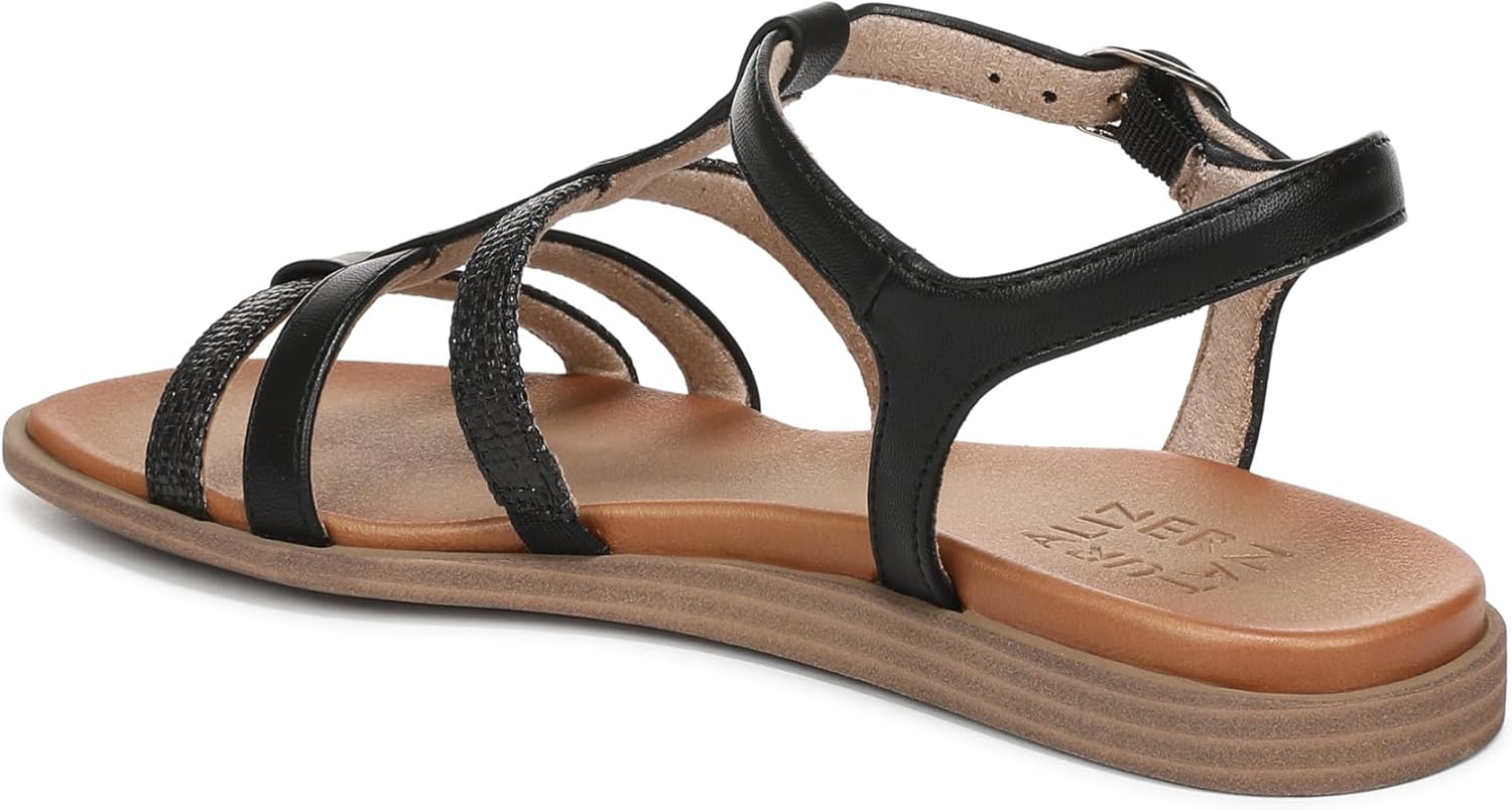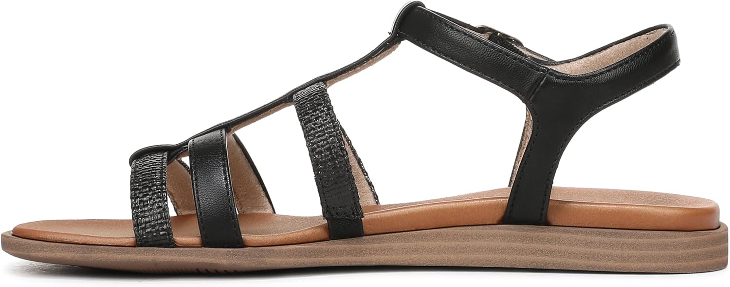 Streamlined straps, minimalist mindset—this strappy sandal is the open toe flat poised to elevate every plan. An ankle buckle secures our signature Contour+ Comfort technology, delivering style that feels effortless from dawn to dinner. MATERIALS: Faux leather upper. Synthetic lining and insole. FEATURES: Adjustable buckle closure, flat heel, dual straps and back strap. COMFORT: Extra cushioning, enhanced flexibility, shock absorption. HEEL HEIGHT: 1 inch. TOE: Open toe.