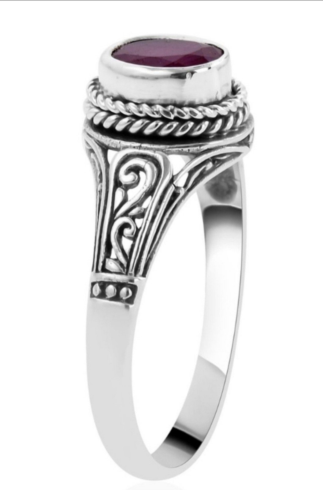 Inspired by a solitaire theme, this genuine gemstone ring signifies precious moments in life. Solitaire ring styles are the perfect gift for weddings and anniversaries as they deliver a timeless and classy appeal. This ring features an oval-shaped gem in the center set in a bezel safe, guarding, and intensifying its beauty. The rope-like pattern that encircles the center gem highlights the detailed intricacies that make this ring look unique. The magnificent artwork features a leaf and metal swirl patterns on the open framework of the shank depicting the artisan’s creativity. Crafted in sterling silver this ring is perfect for daily wear.Each Bali Legacy piece is handcrafted and made using hand-held ancient tools each reflecting the precision and time this solitaire ring takes to develop into a beautiful piece of art.