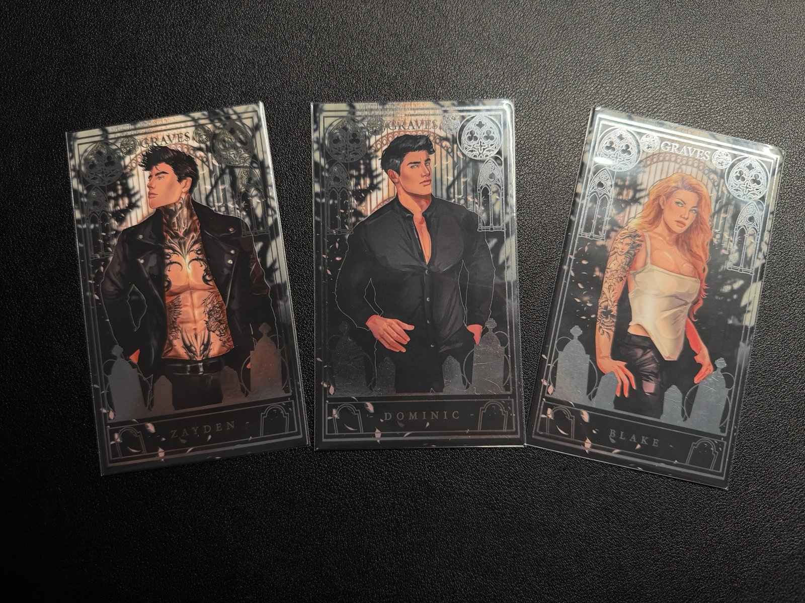 Graves by Katelyn Taylor cards art done by Jemlin. I purchased from someone else and decided not to keep. There are some scratches on the foil and Zayden has some wear on the foil over his hand. These aren’t super obvious unless you are looking closely. They will also come in protective sleeves to prevent anymore wear.