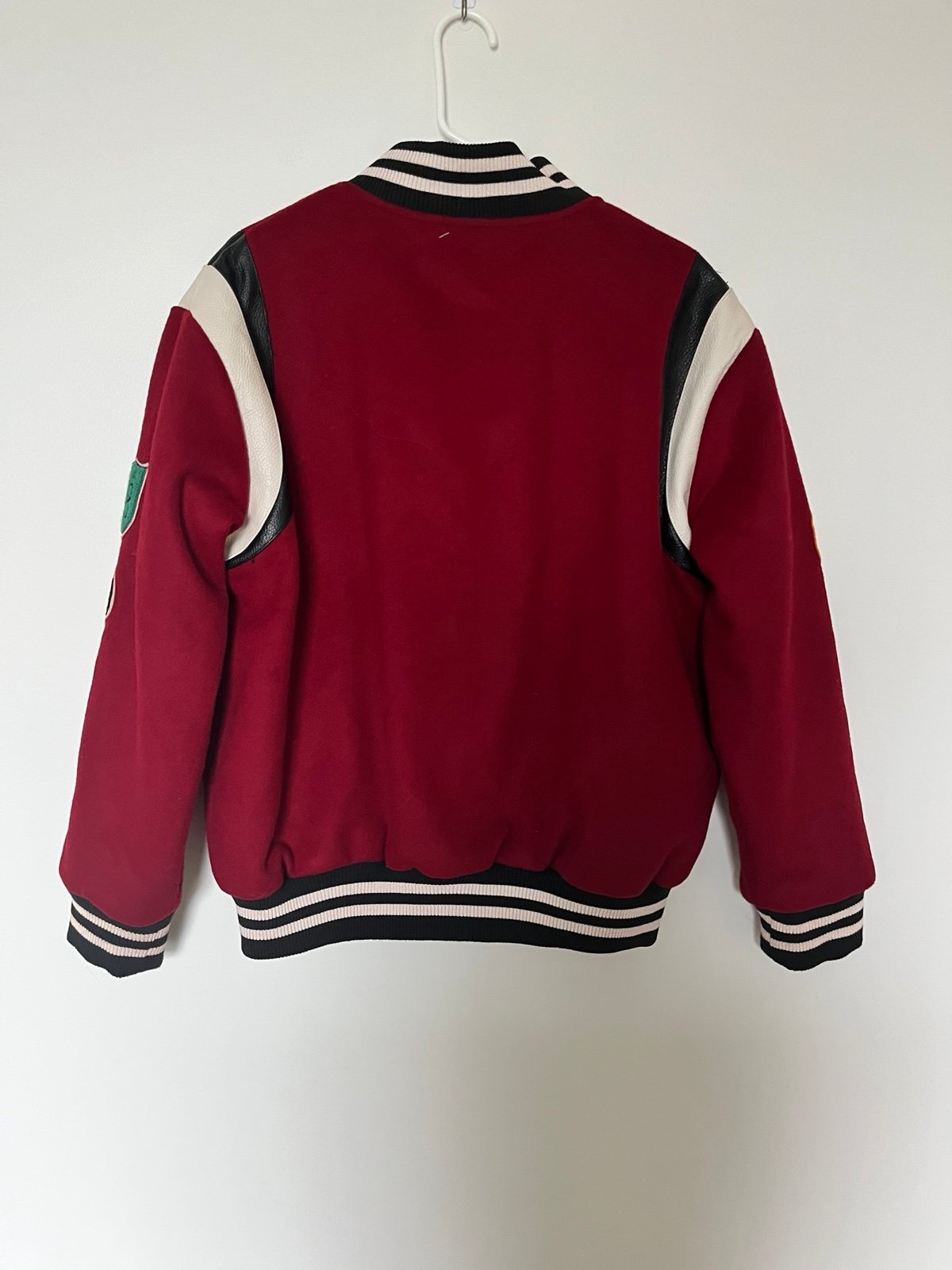 Just as versatile as it is vintage-inspired, this staple varsity jacket is featured in an oversized, slouchy fit with rounded shoulders, striped hems, and exaggerated patching throughout for a true lived-in look.