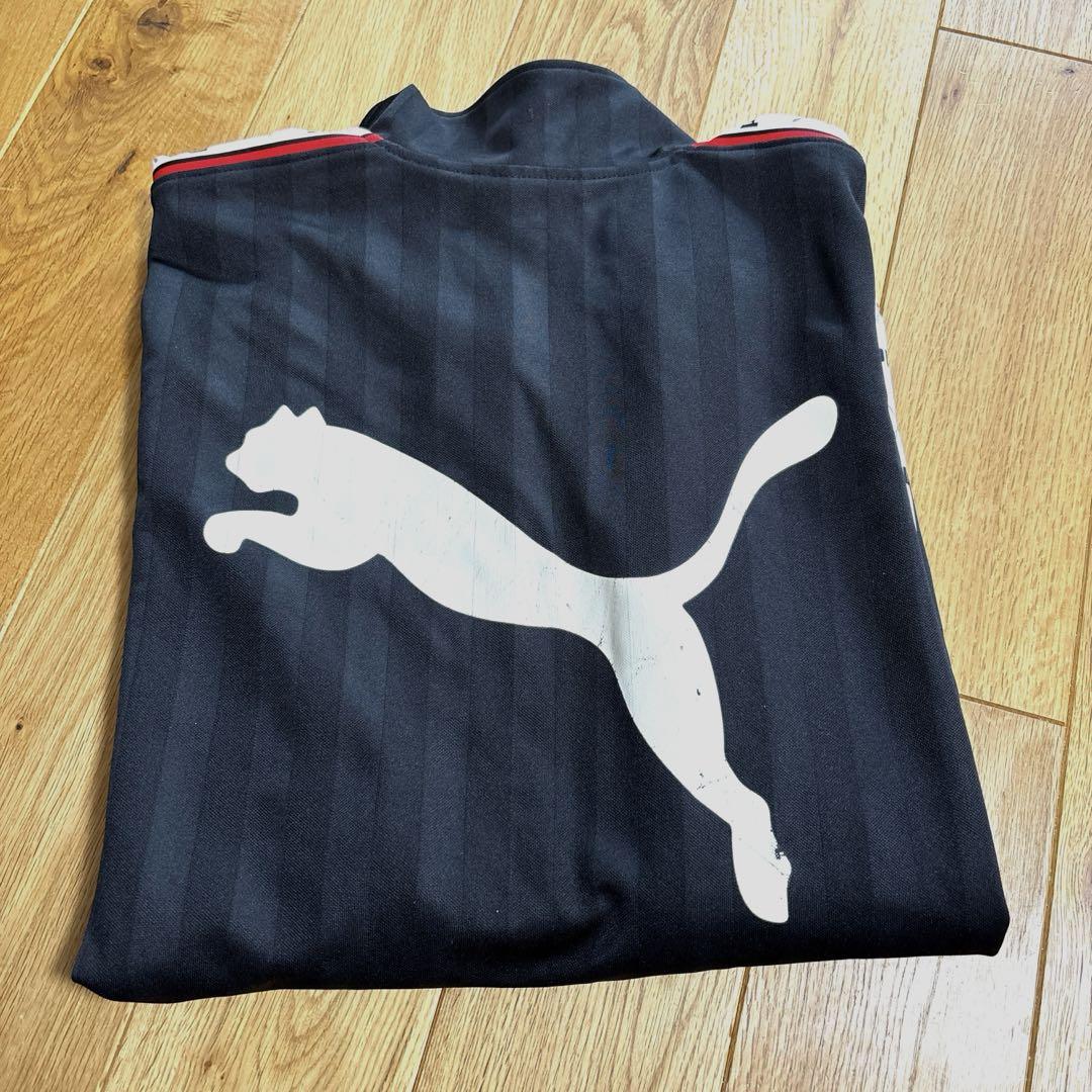 The PUMA logo on the back has deteriorated a bit, but the logos on the sleeves, hem, and chest are in relatively good condition.