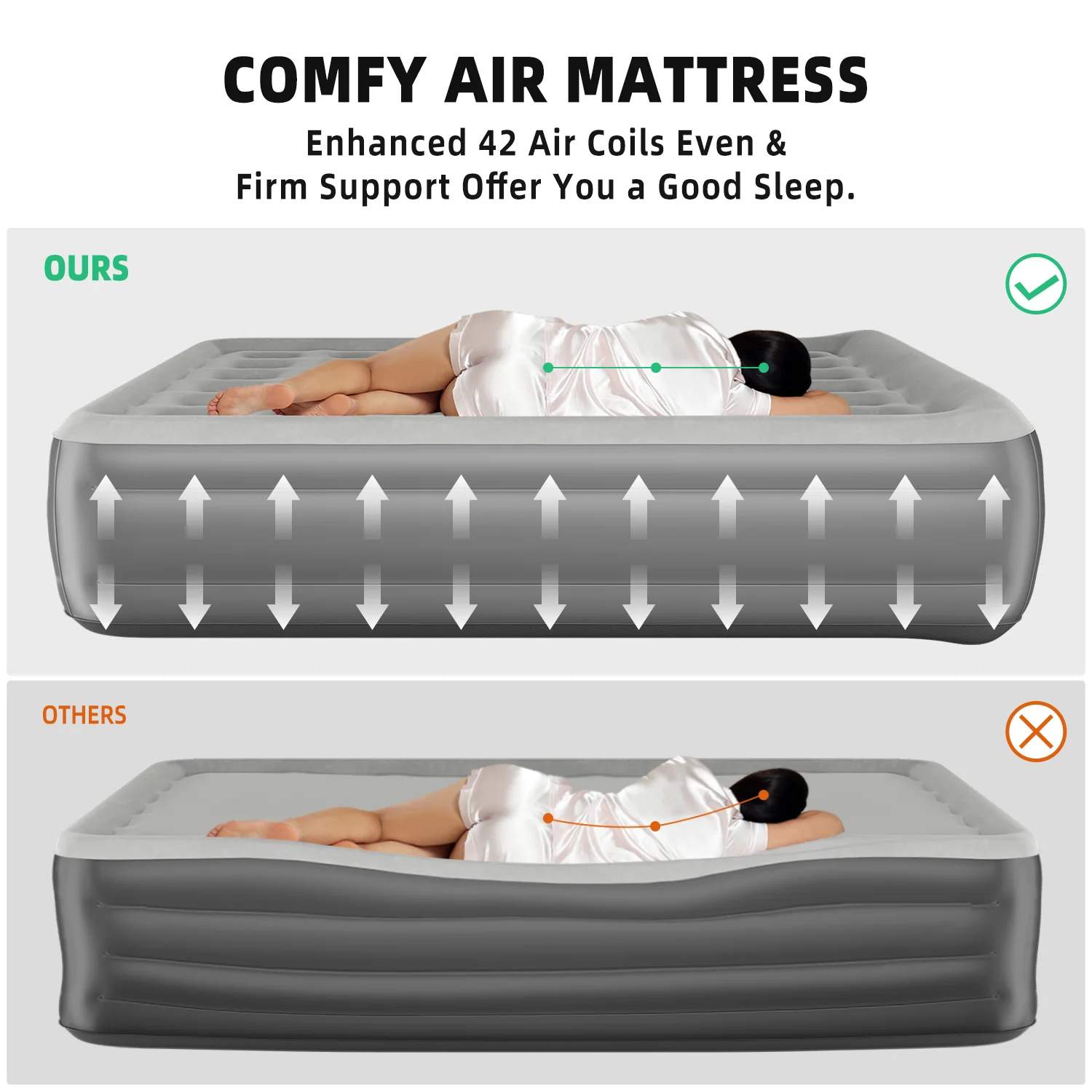 Four-chamber structure: Unique and innovative four-chamber structure, making the whole mattress extremely supportive and comfortable. Enjoy the ultimate comfort and support with a maximum load capacity of 500 pounds and features a no-slip base, ensuring stability and a perfect sleep posture all night.