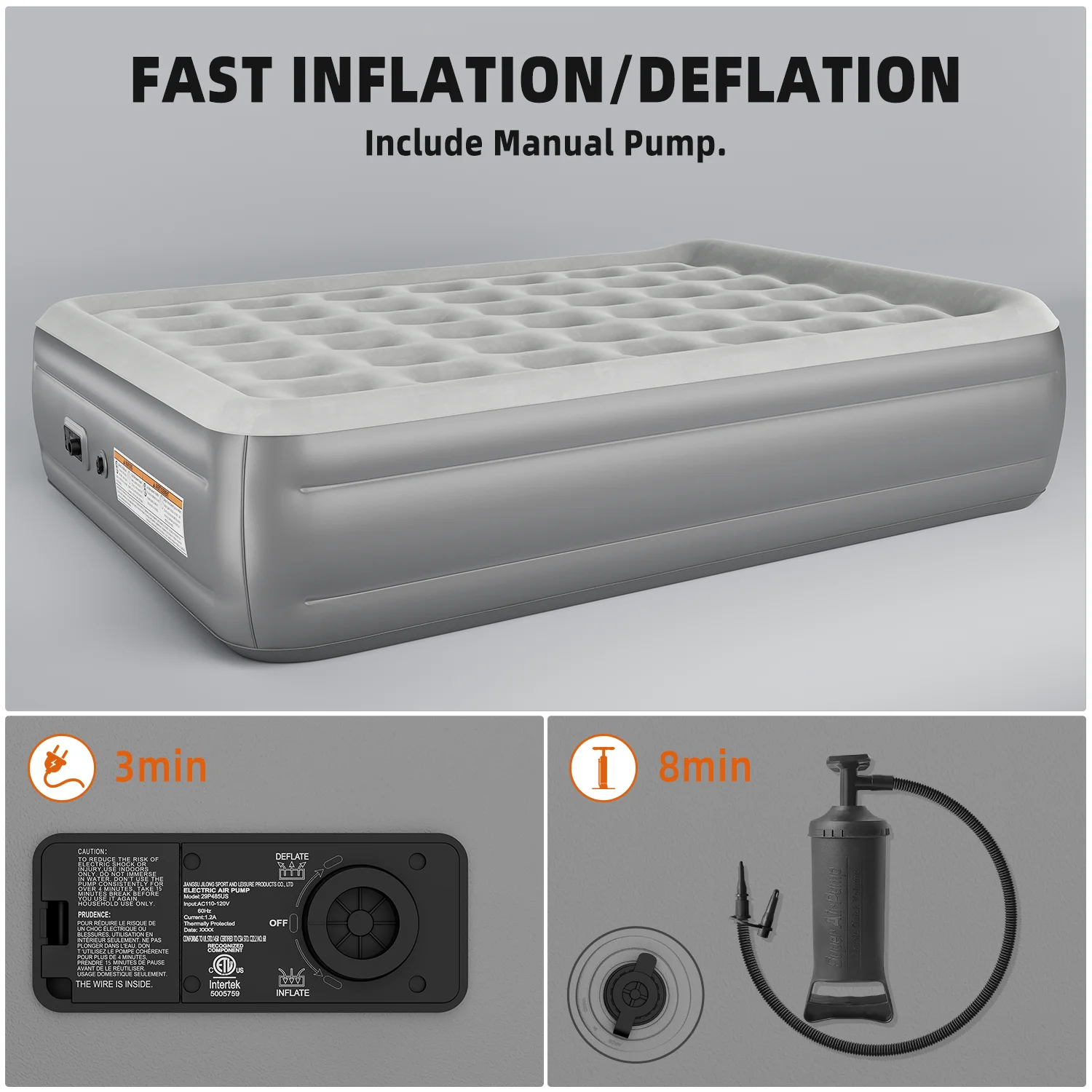 Quick Inflation, Easy to Transport: Our air bed is equipped with a built-in pump, which can inflate the mattress in 3 minutes. After use, it can be easily deflated, folded & stored in a compact storage bag, which is convenient for you to take it anywhere.