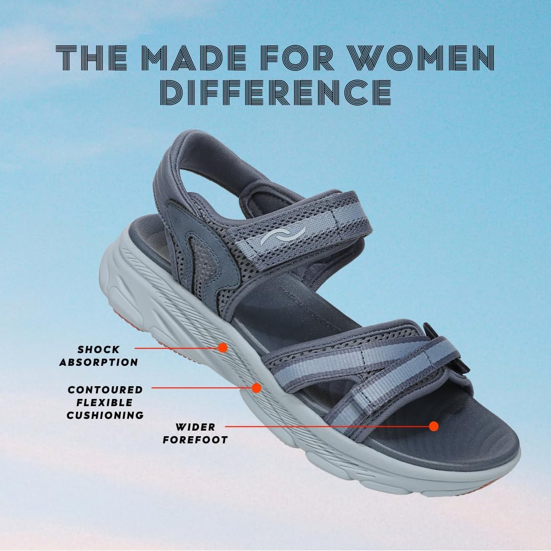 The newest addition to our bestselling Devotion Series. Fuel every stride with comfort and freedom in sport sandals designed with supportive straps. BEST FOR: Lifestyle. RYKÄQ TECH: Built for a woman's quadricep muscle Q ANGLE with a narrower heel, roomier toe + contoured cushioning for stability. MATERIALS: Breathable open mesh with webbing overlays + soft fabric linings + padded back strap for heel comfort. CLOSURE: Hook-and-loop closure at forefoot and ankle. INSOLE: Molded EVA footbed with arch support. OUTSOLE: Dual Density EVA. WEIGHT: 160g/5.6oz per shoe. HEEL-TO-TOE DROP: 10.5mm.