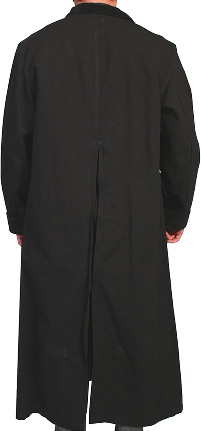 Travel back to the Old West with this classic men's duster. The long coat is made of heavy-duty canvas with corduroy cuffs and collar. A metal button front placket will protect you from the elements. A saddle gusset and inside leg straps are designed for bad-weather riding. Even men on the frontier needed pockets - this western duster coat includes two front flap pockets.