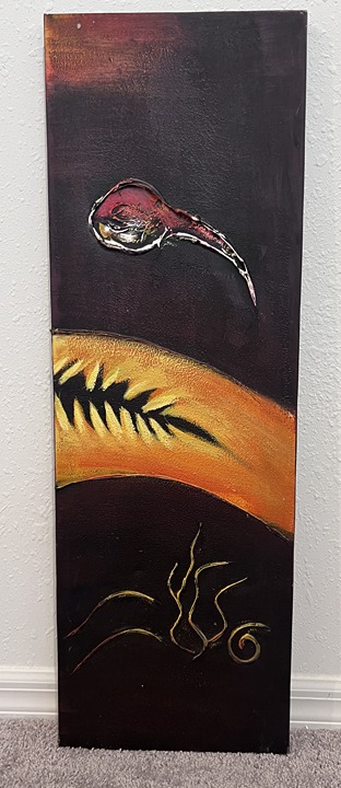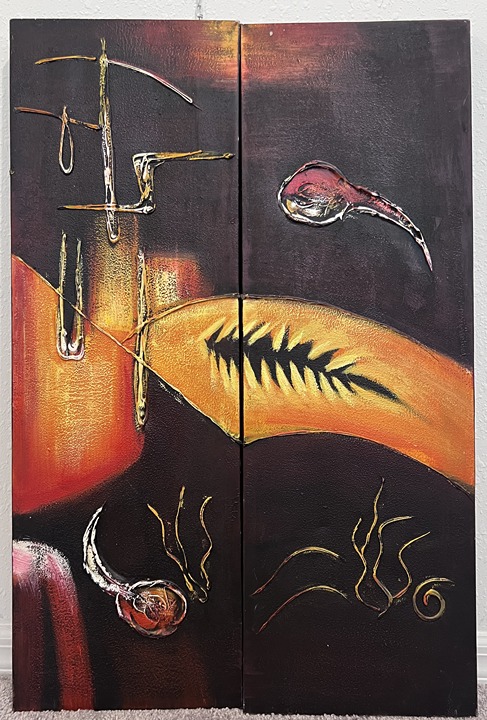 This striking set of two original abstract paintings radiates energy and movement through rich texture, dimensional elements, and a bold palette of warm earth tones and deep crimson. Each canvas tells a silent story—fluid organic forms resembling pods, tendrils, and surreal seed-like structures dance across a background split by golden arcs and rough impasto marks.