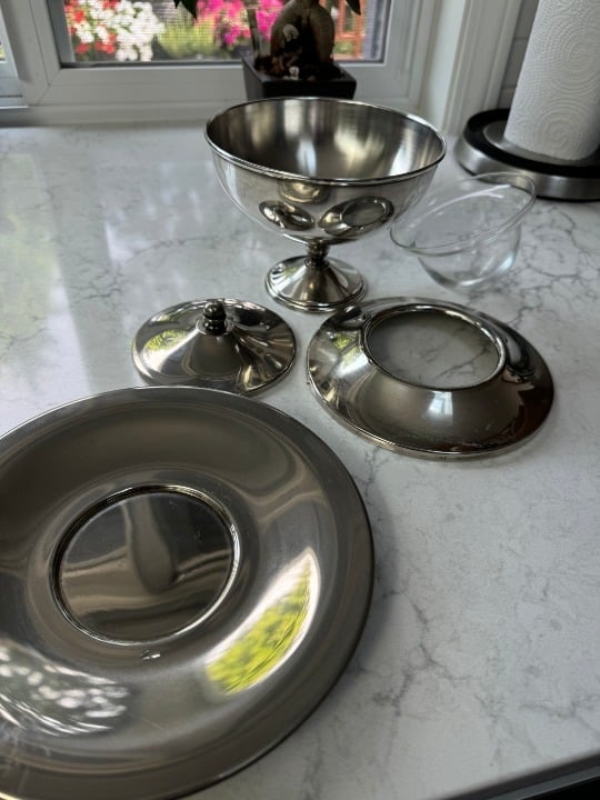 Beautiful Raimond silver plated caviar server with undertray. Made in Italy. Measures 7" tall with lid, Glass caviar bowl 4" diameter, Ice bowl 6", Undertray 8". No flaws. Bundle other items from my list to save on shipping.