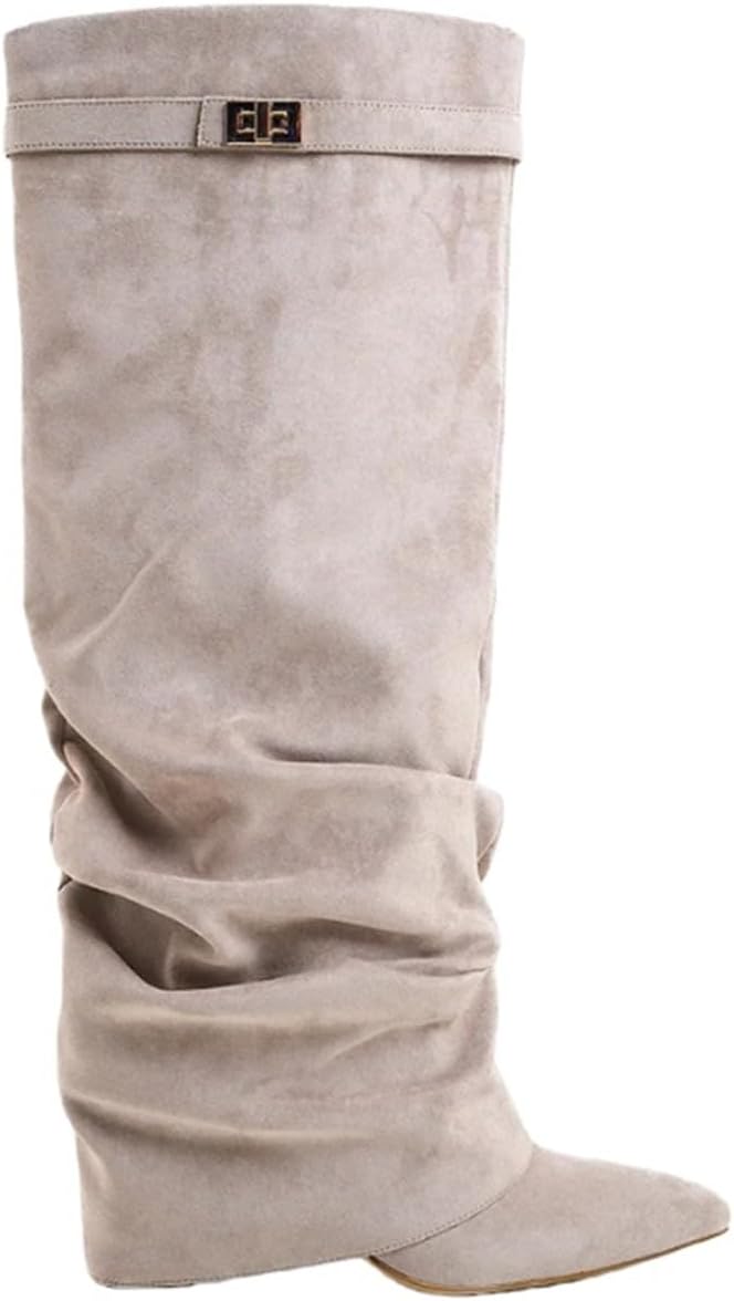The boots feature an amazing handmade suede material whichcovers the whole of the shoe including the leg for maximum effectwith a stunning fold over detail. The boot also feature a cute buckledetail on top and have a hidden heel. style with knitwear for a glamfalllook.