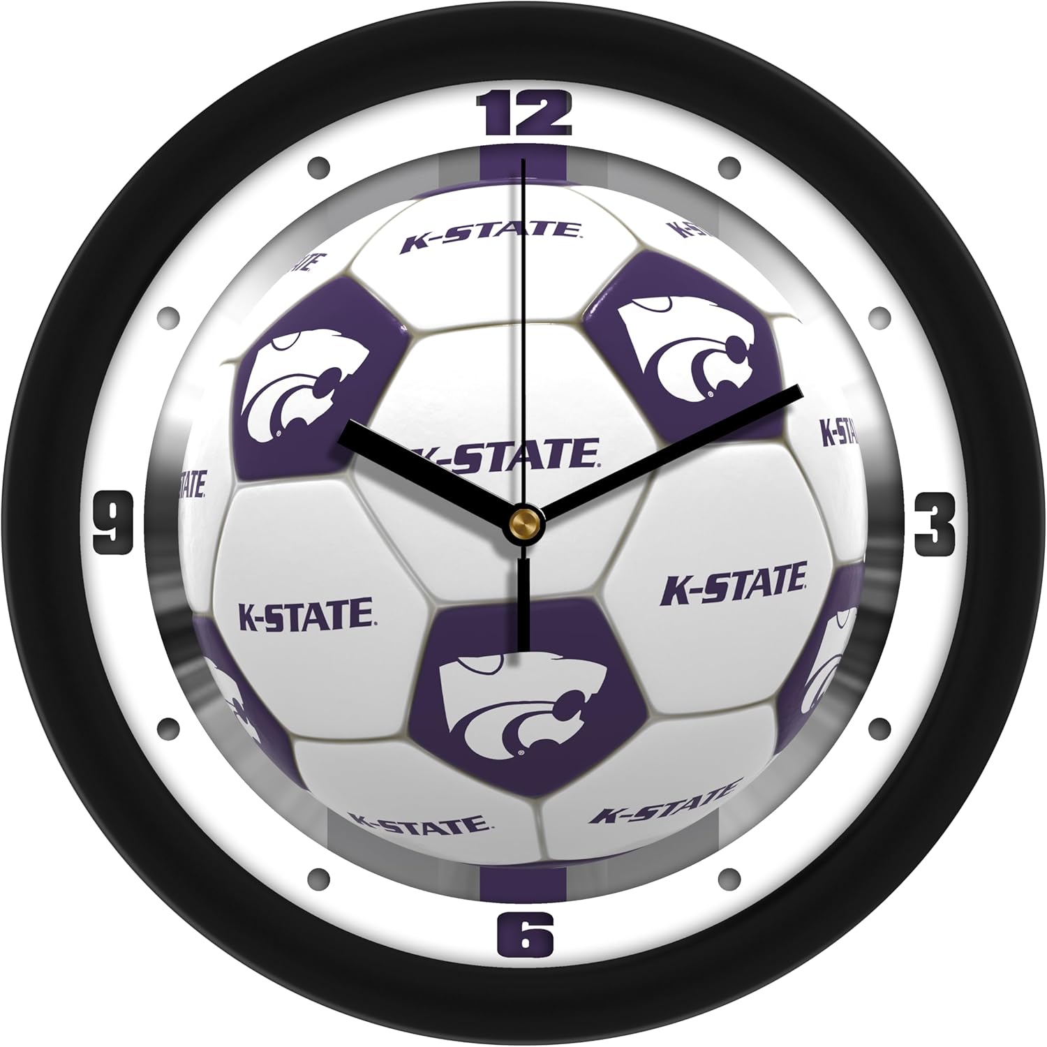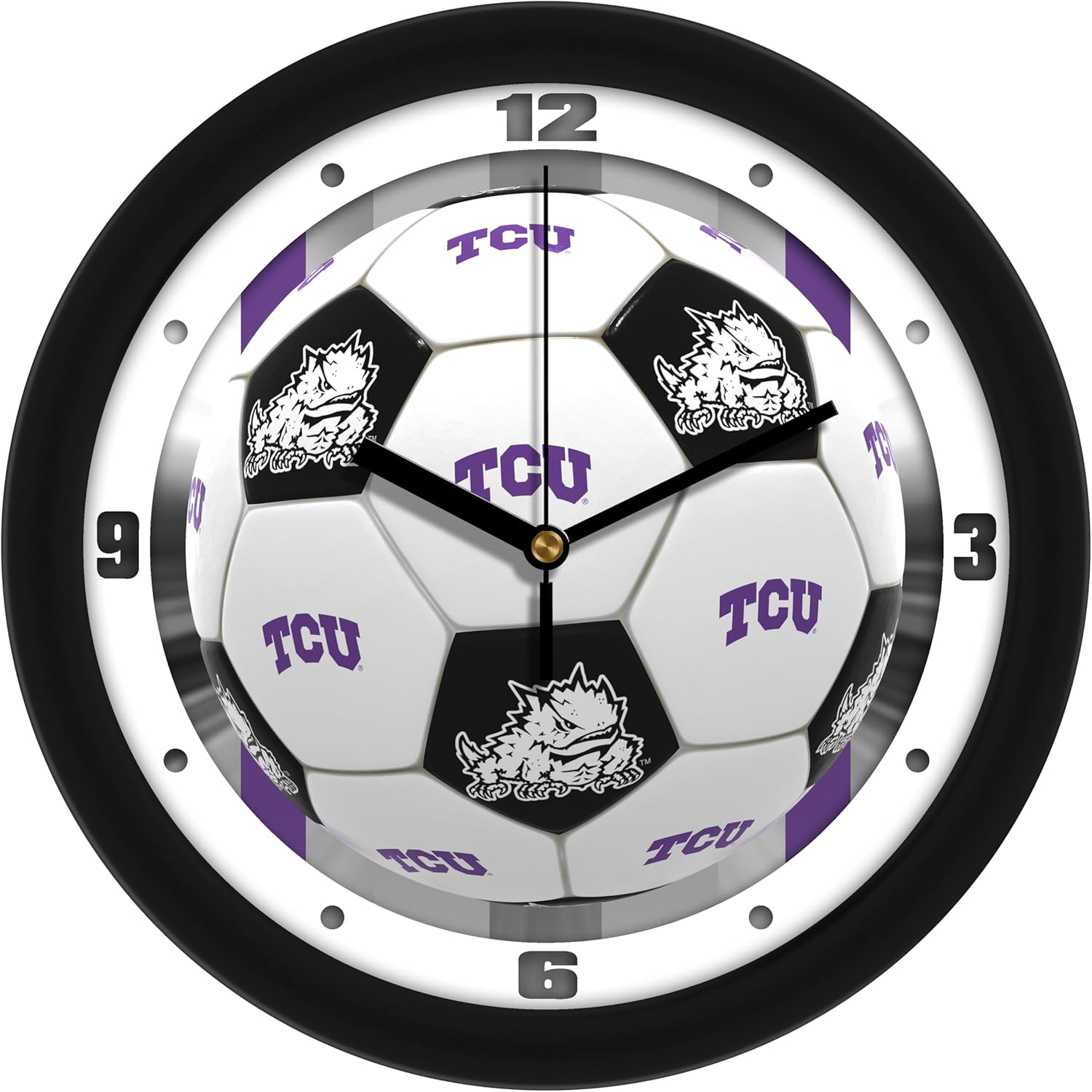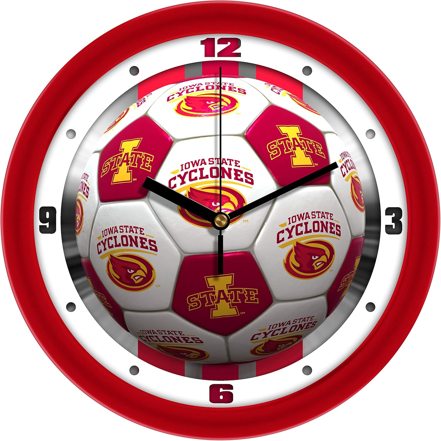Soccer Wall Clock by Suntime Demonstrate your team spirit in your home or office with your favorite college logo. These 11.5 inch Soccer Wall Clocks feature a battery-powered (1xAA battery not included) quartz accurate movement. Unlike plastic wall clocks, you experience superior visibility with our mineral glass crystal. The printed ring on the crystal displays the numbers with a school color-coordinated outer bezel. Clock Measures: 11.5" x 11.5"