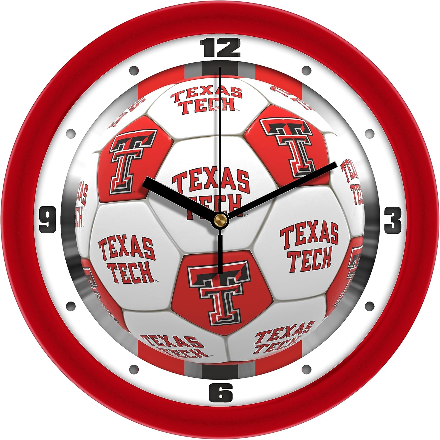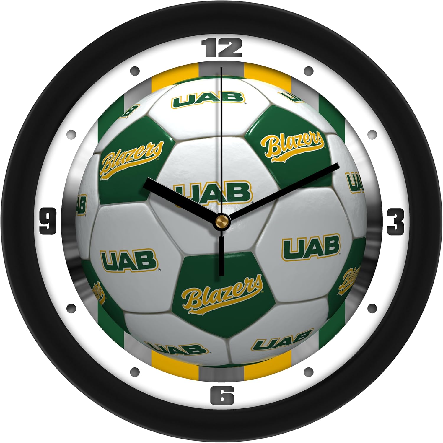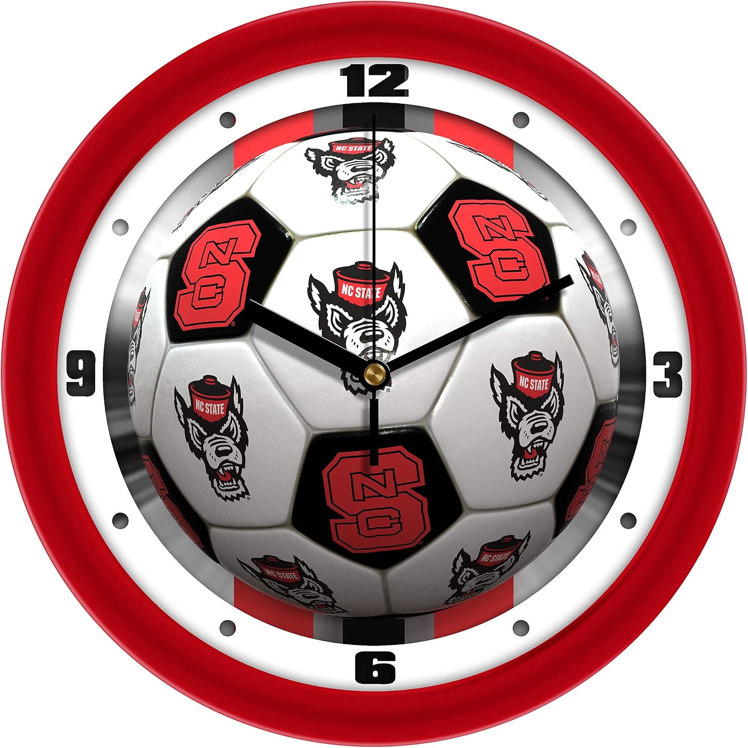 Soccer Wall Clock by Suntime Demonstrate your team spirit in your home or office with your favorite college logo. These 11.5 inch Soccer Wall Clocks feature a battery-powered (1xAA battery not included) quartz accurate movement. Unlike plastic wall clocks, you experience superior visibility with our mineral glass crystal. The printed ring on the crystal displays the numbers with a school color-coordinated outer bezel. Clock Measures: 11.5" x 11.5"