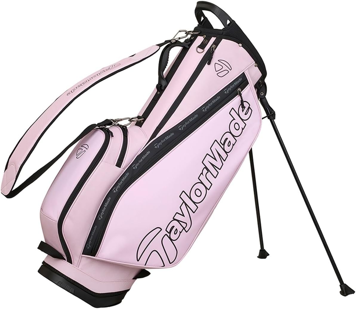 The bold outline logo and sleek form are completed in one style. You can choose a model that matches your personality and style. This stand bag is made of polyester and synthetic leather for a lightweight design and features a stand that is integrated into the bottom