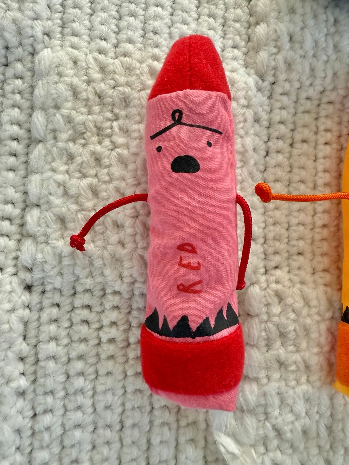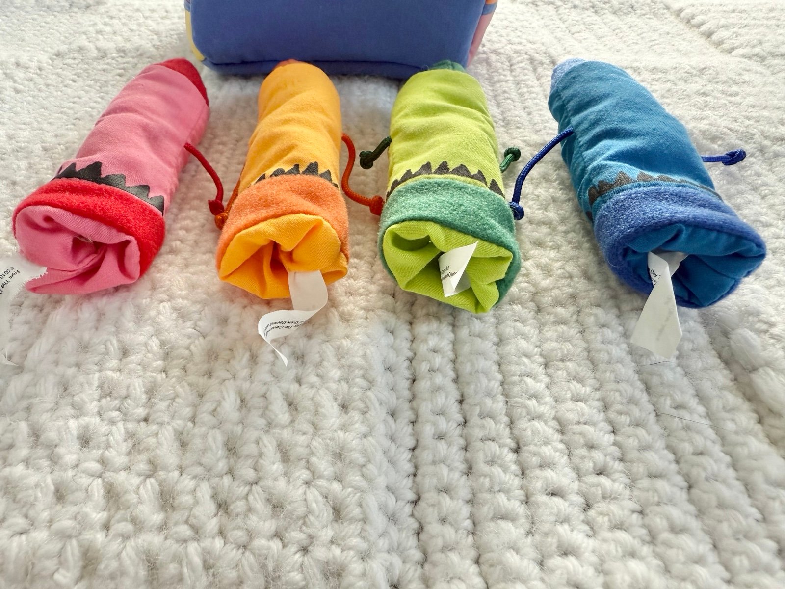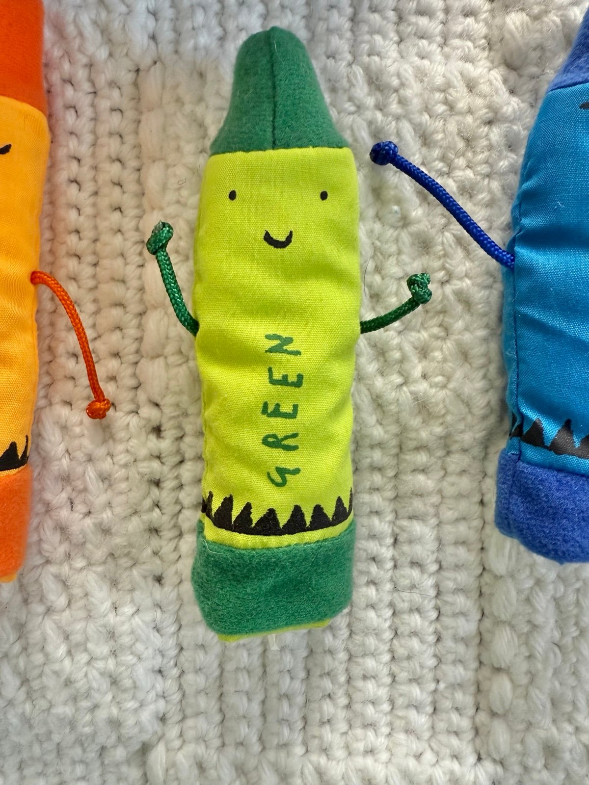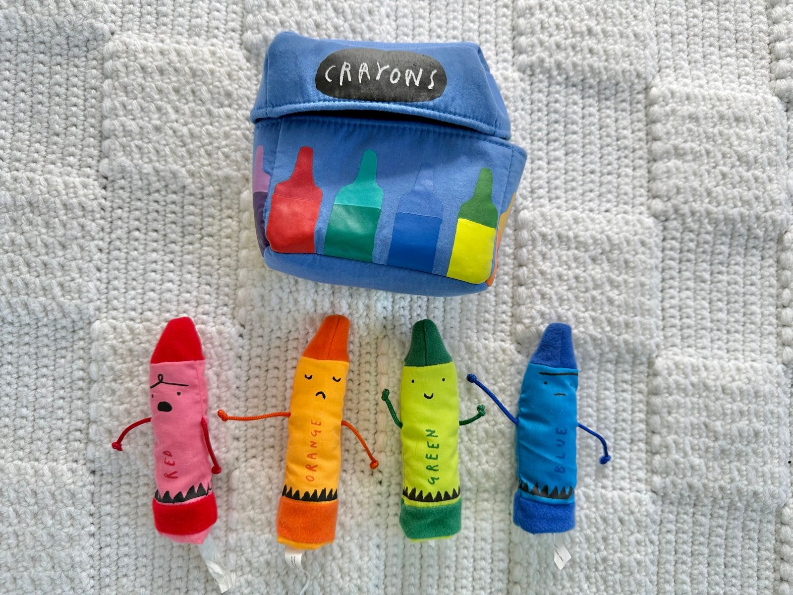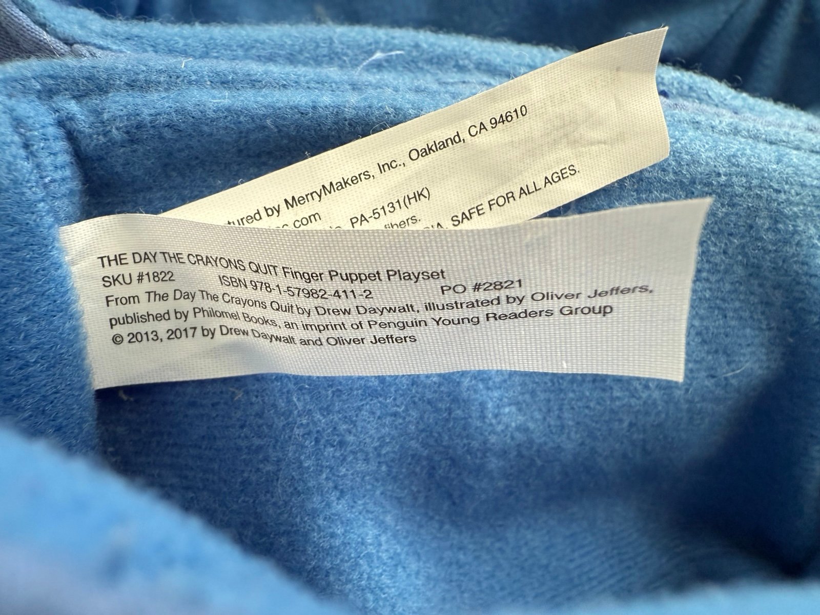 Super cute plush pinger puppet set featuring the coloring crayons from The Day The Crayons Quit. 4 finger puppet crayons fit inside the plush crayon box. Great for imaginative play and reading along with the story.