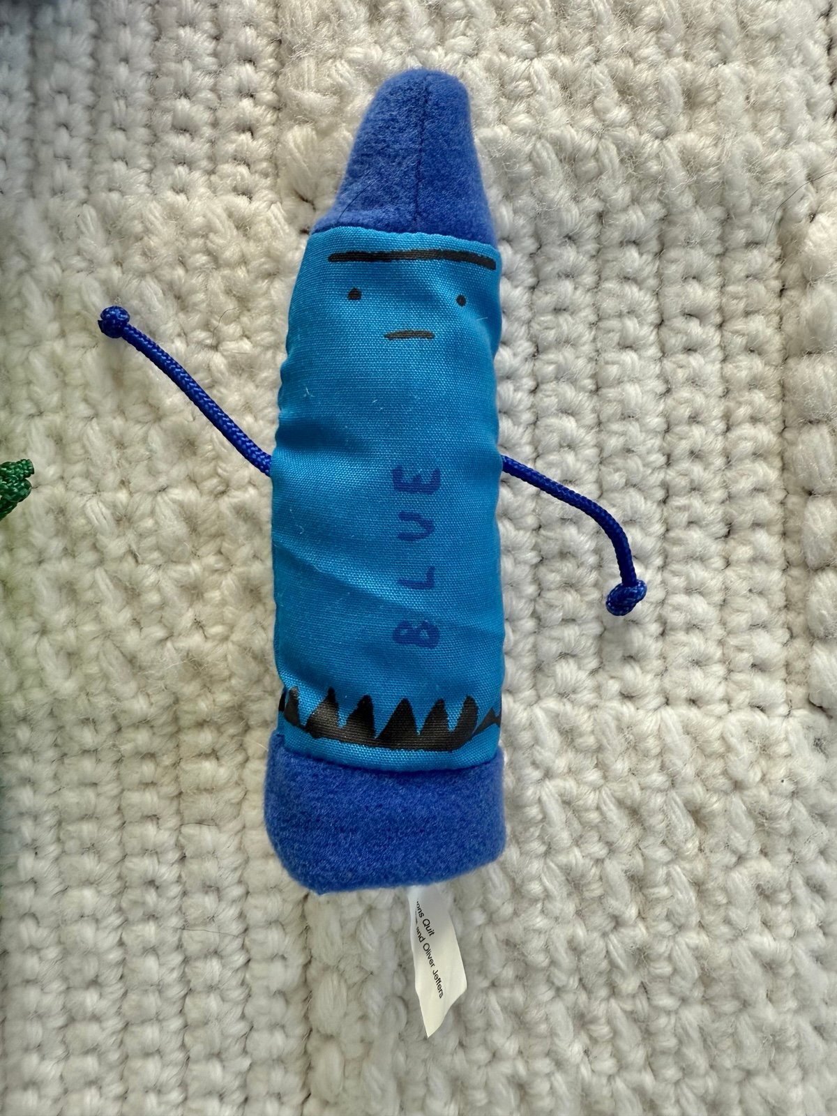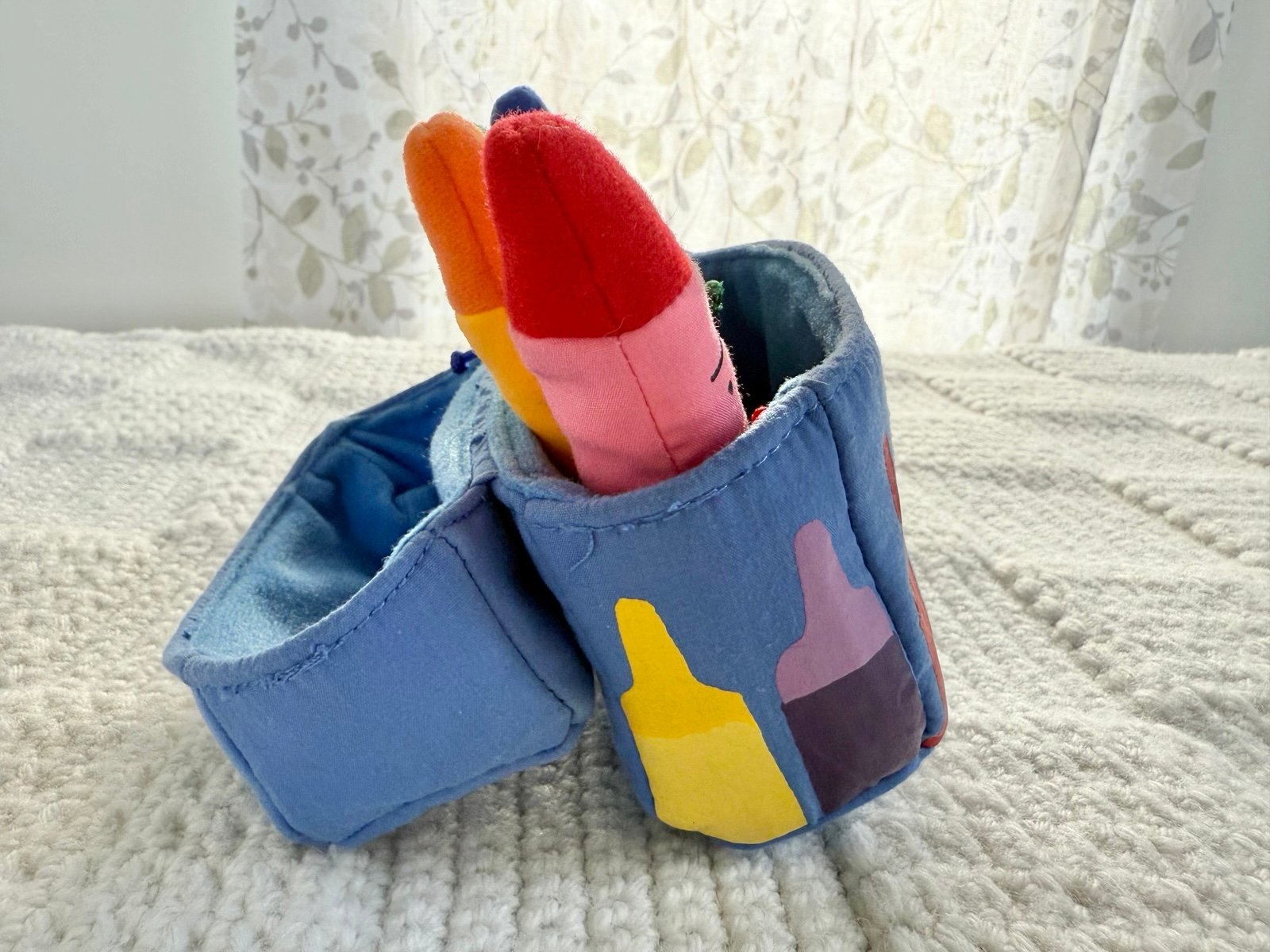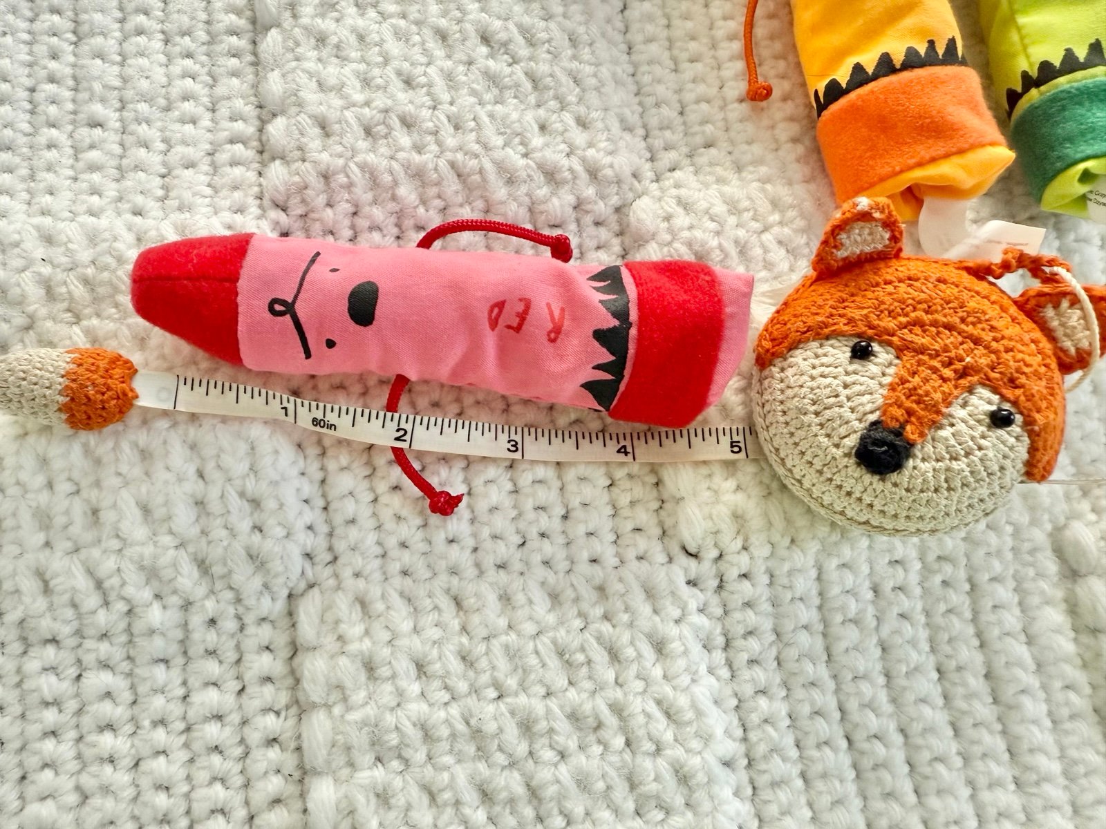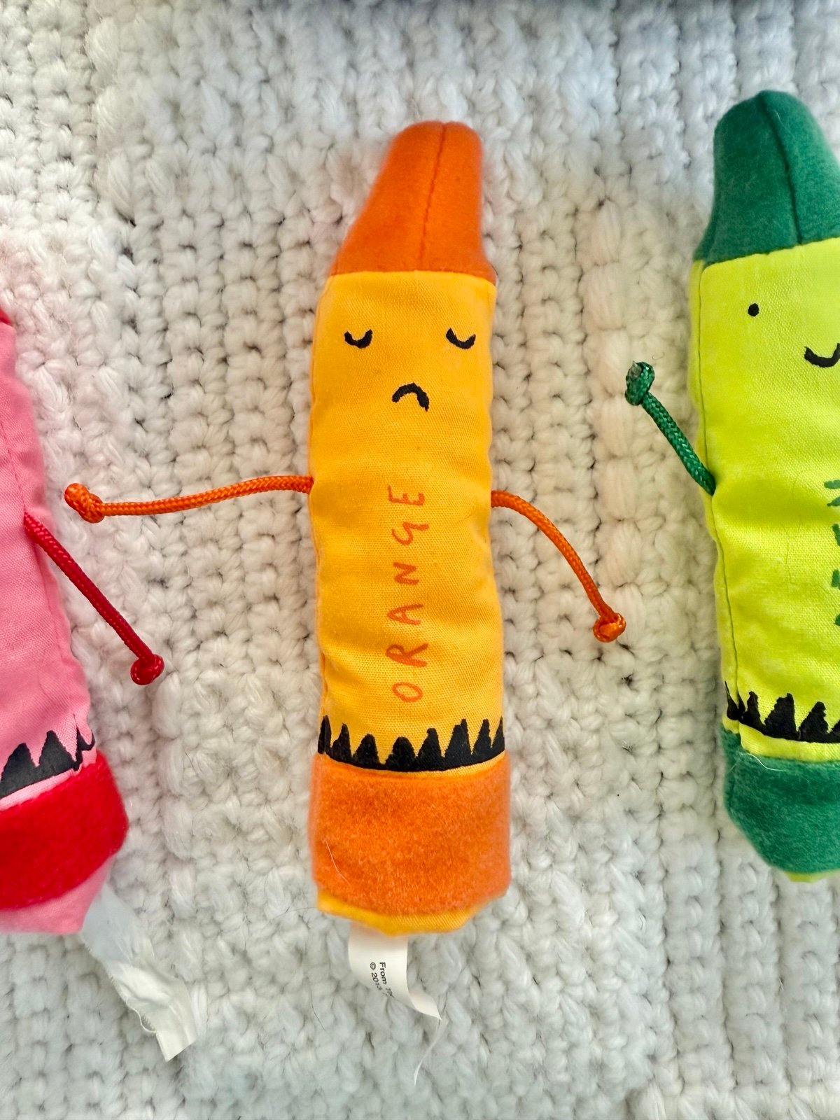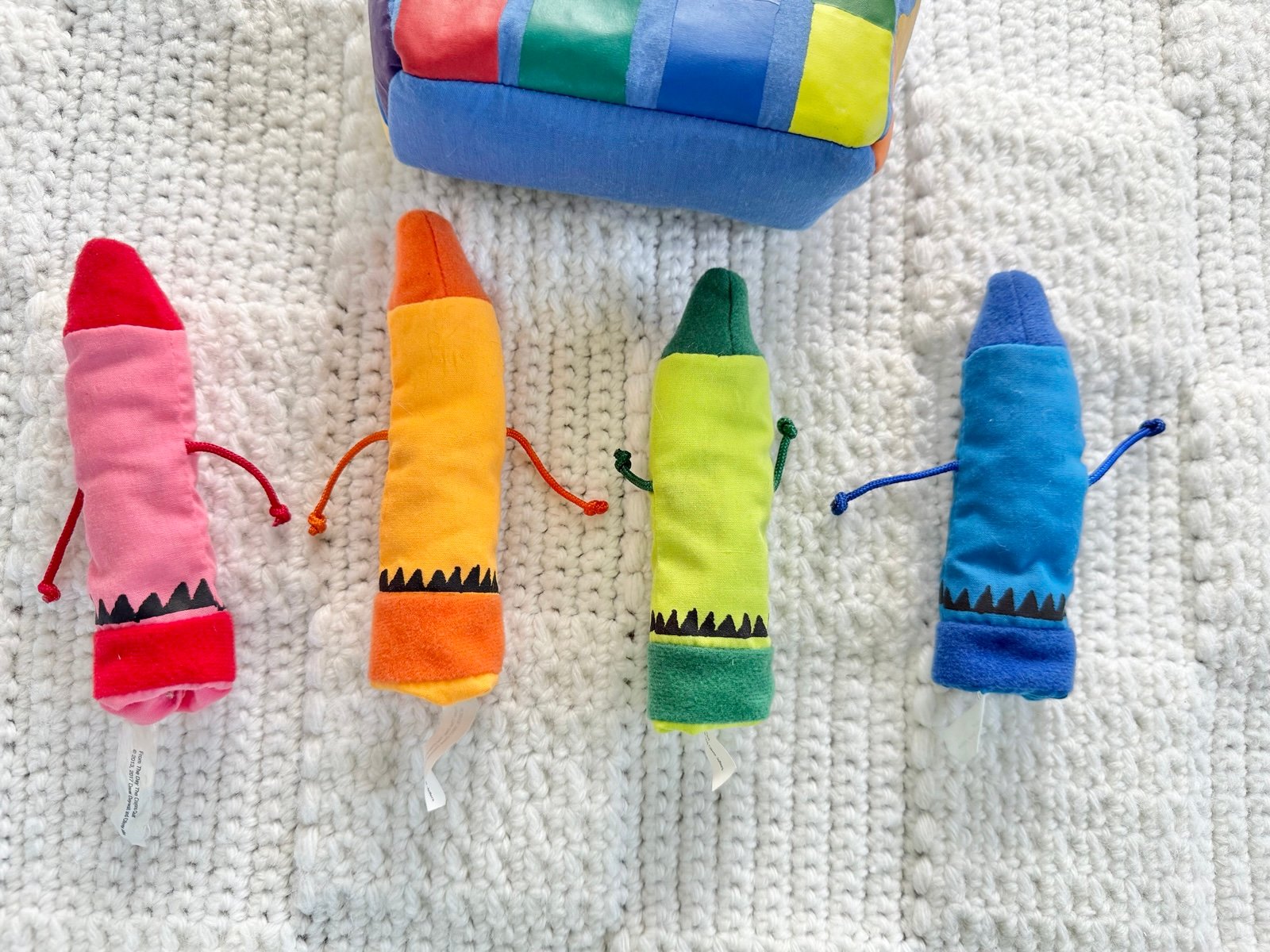 Super cute plush pinger puppet set featuring the coloring crayons from The Day The Crayons Quit. 4 finger puppet crayons fit inside the plush crayon box. Great for imaginative play and reading along with the story.