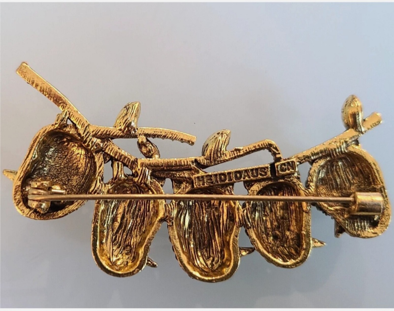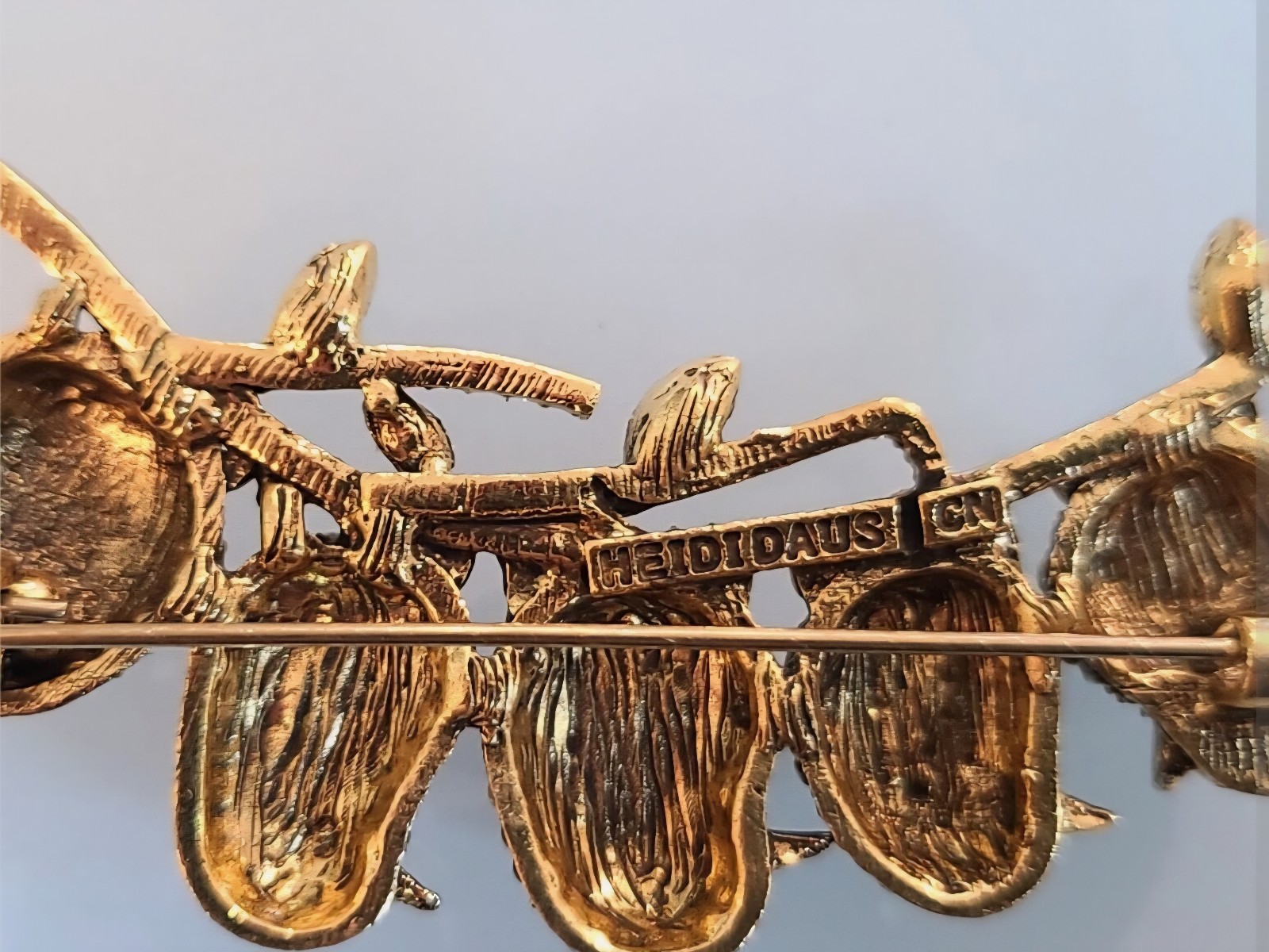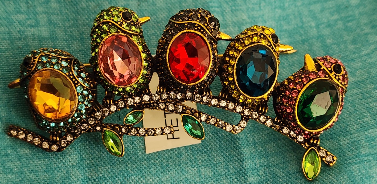 This is a delightful HEIDI DAUS 5 COLORFUL SONG BIRDS ON A BRANCH WITH LEAVES CRYSTAL RHINESTONE BROOCH/ PIN. It is signed Heidi Daus.
