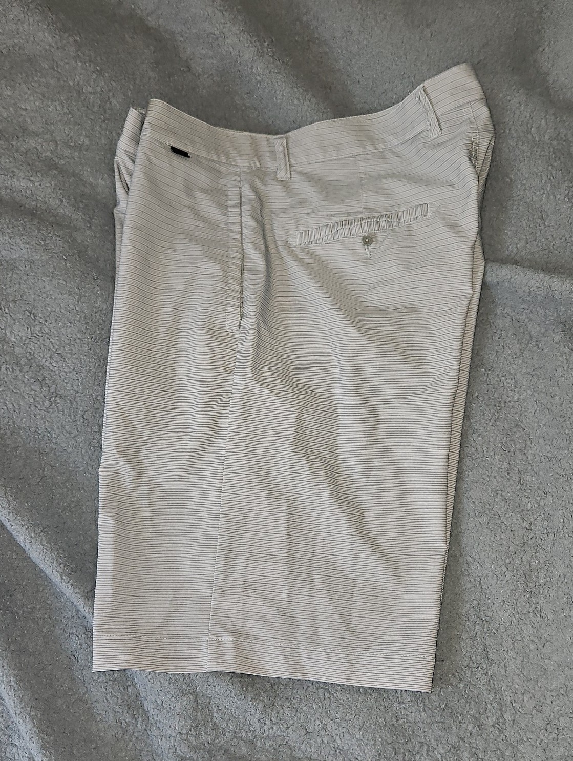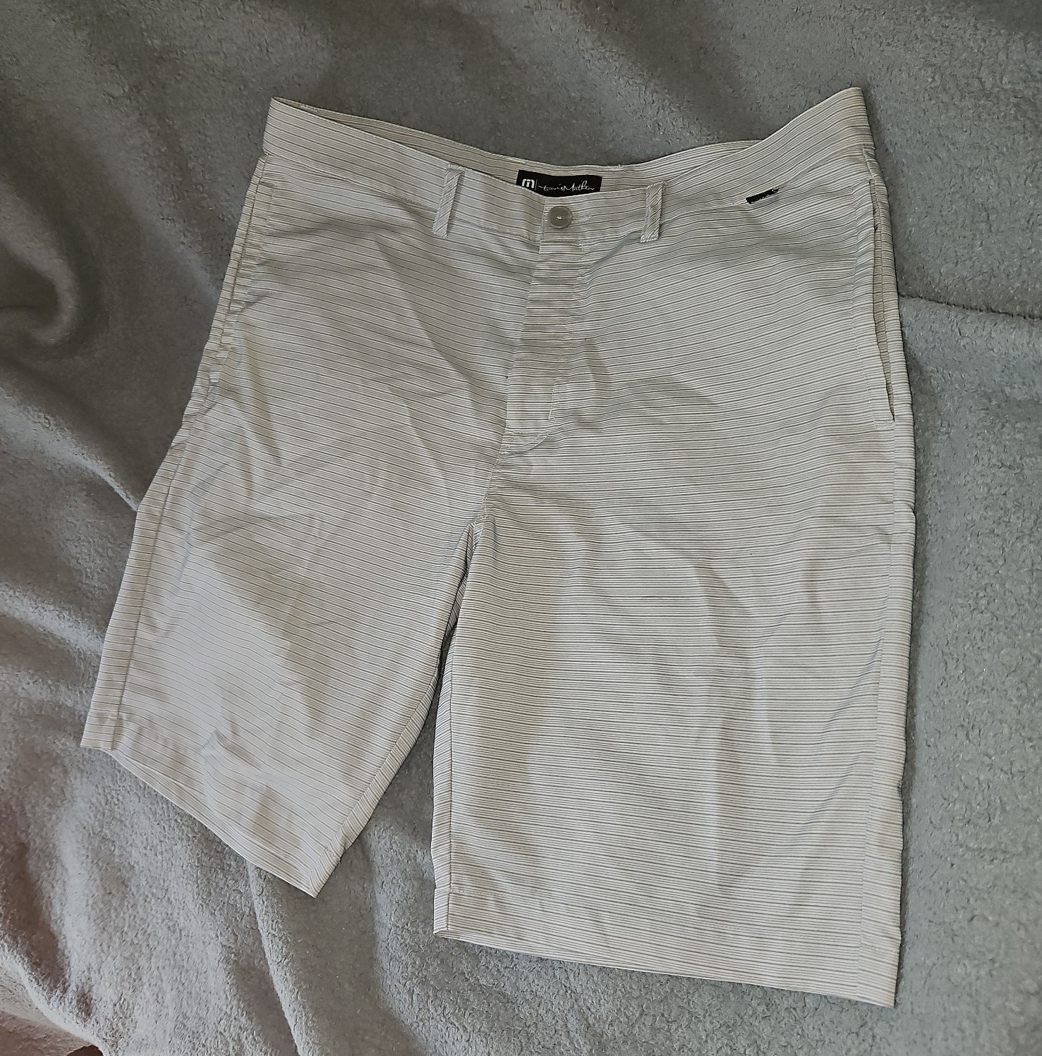 TRAVIS MATHEW Men's Performance 4-Way Stretch Flat-Front Chino Hybrid Golf Shorts. Gray color. Men's size 36. Measures 12" rise and 10" inseam. Has 2 side pockets, 2 back pockets, 4-Way Stretch for added comfort. Polyester/Spandex blend. Great condition.