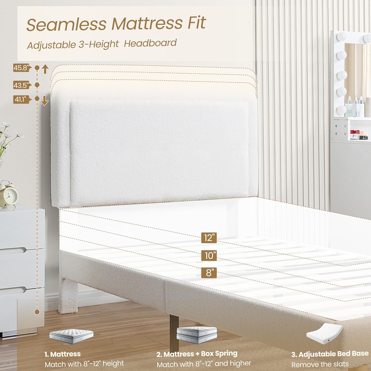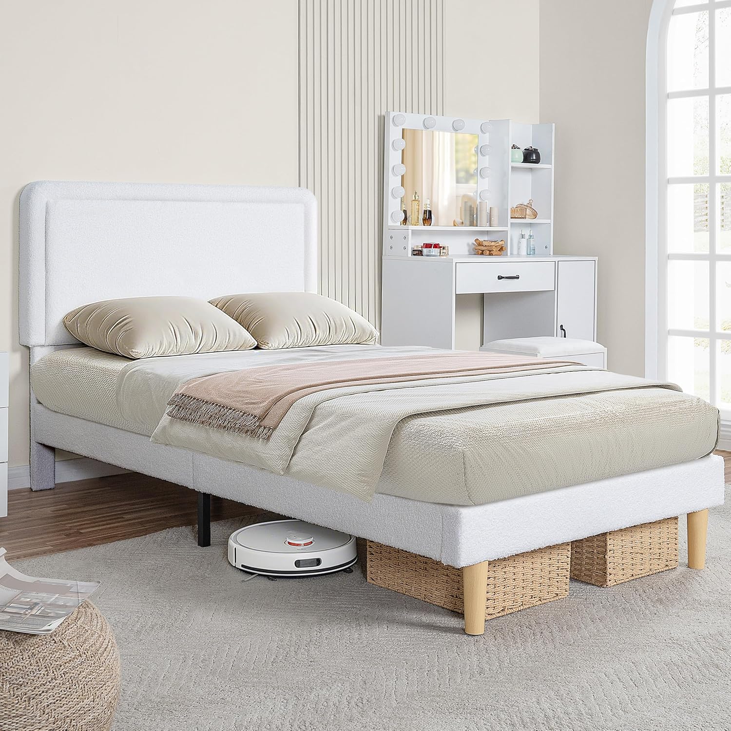 | Headboard Material | Wood and Boucle Fabric |