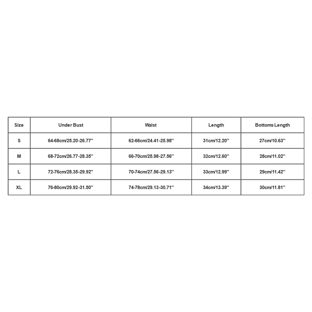| Size:S | Under Bust:64-68cm/25.20-26.77'' | Waist:62-66cm/24.41-25.98'' | Length:31cm/12.20'' | Bottoms Length:27cm/10.63'' |