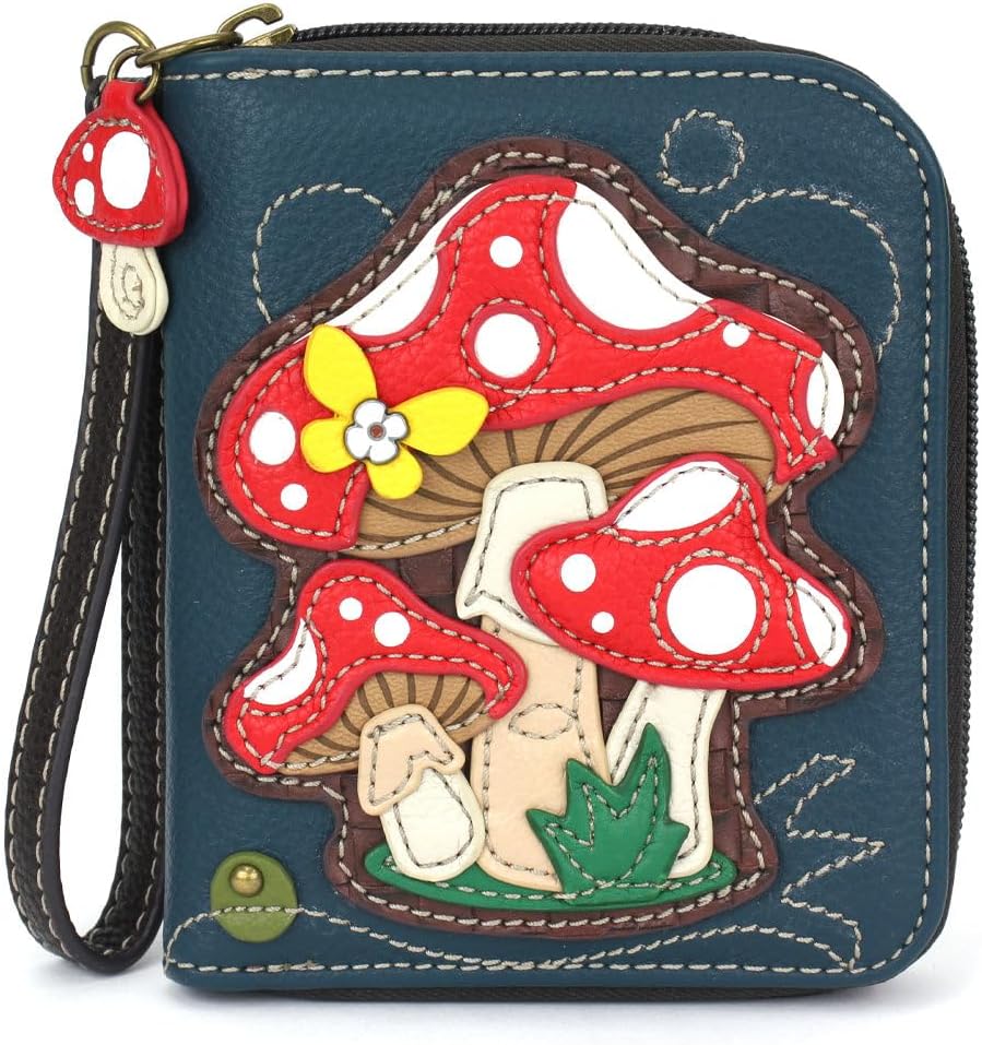 Elegant, Enjoyable, Practical. The front showcases our Mushroom Chala Pal design! Includes a decorative zipper pull charm. Ample slots for cards and cash. A clear slot for photo ID. Back zipper pocket for coins and other small items.